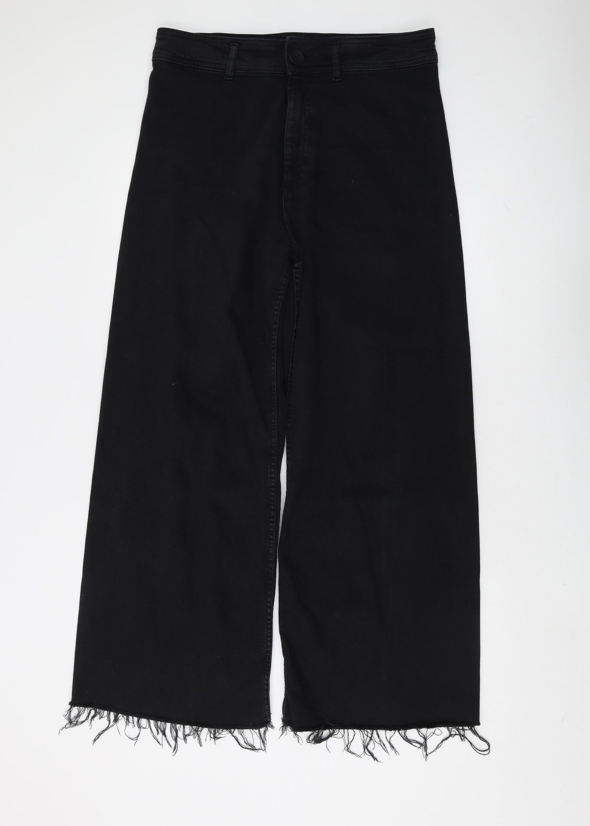 Elevate your wardrobe with these chic black wide-leg jeans from Zara, designed for modern women who appreciate comfort and style. Made from high-quality denim, these jeans boast a balanced blend of 90% cotton, 8% polyester, and 2% elastane, ensuring a comfortable fit and lasting durability. The wide-leg style provides a contemporary silhouette, perfect for pairing with both casual and smart-casual outfits.These jeans feature a mid-rise waist, offering a relaxed yet flattering fit that's suitable for various body types. The classic 5-pocket design adds functionality without compromising on style, making them a versatile addition to your collection. The fabric's dark wash offers a sophisticated look, while the absence of patterns allows for easy styling with both bold and neutral tones.Ideal for everyday wear, these jeans are machine washable, ensuring easy maintenance and longevity. Although in excellent pre-owned condition, there is slight wear noticeable at the hems, adding a touch of character without detracting from their overall appeal. Perfect for every season, these jeans promise to be a staple in your wardrobe.Whether you're dressing for a day at the office or a relaxed weekend outing, these Zara wide-leg jeans provide a sleek foundation for any ensemble. Their flattering fit and timeless design will have you reaching for them again and again.