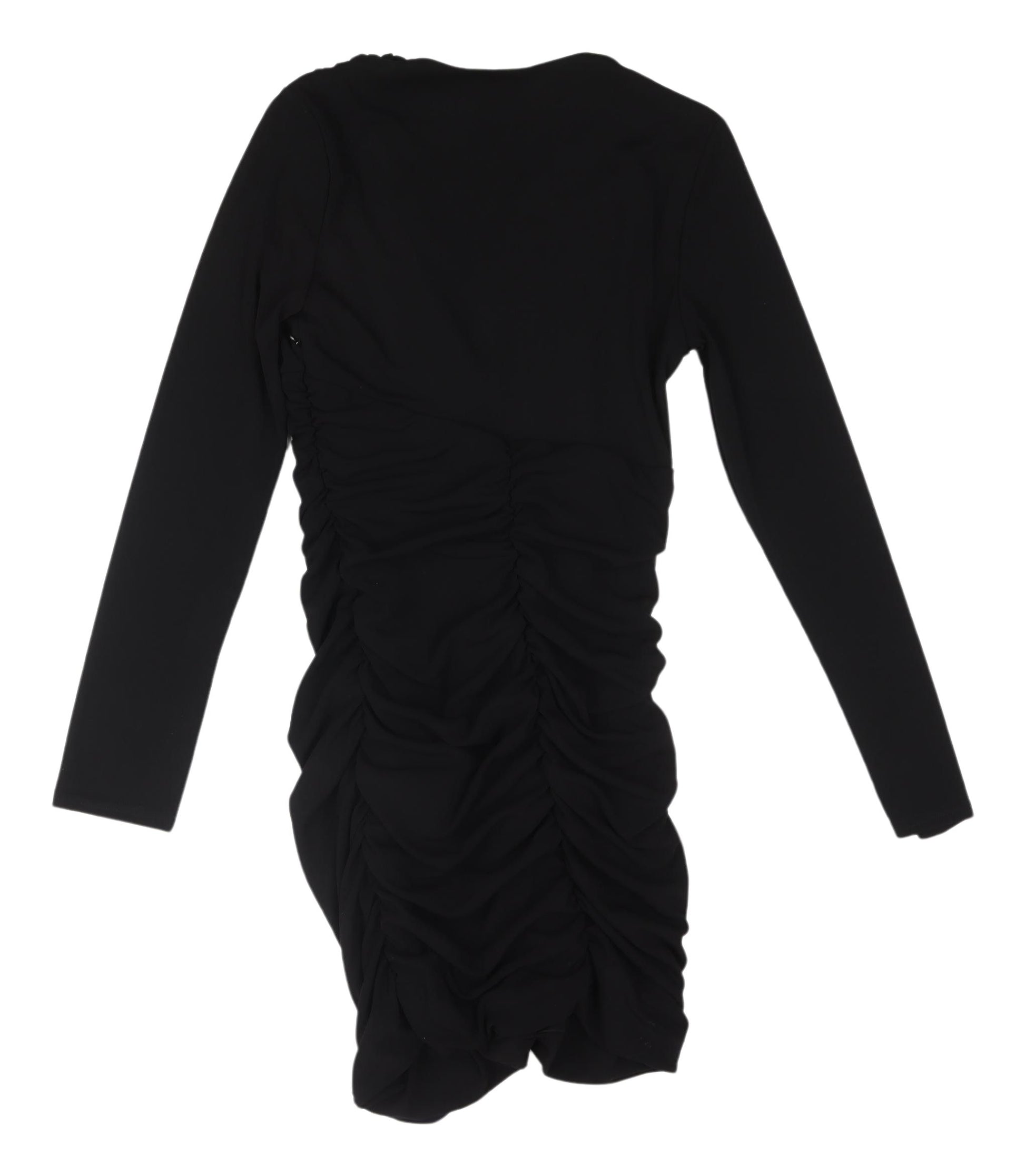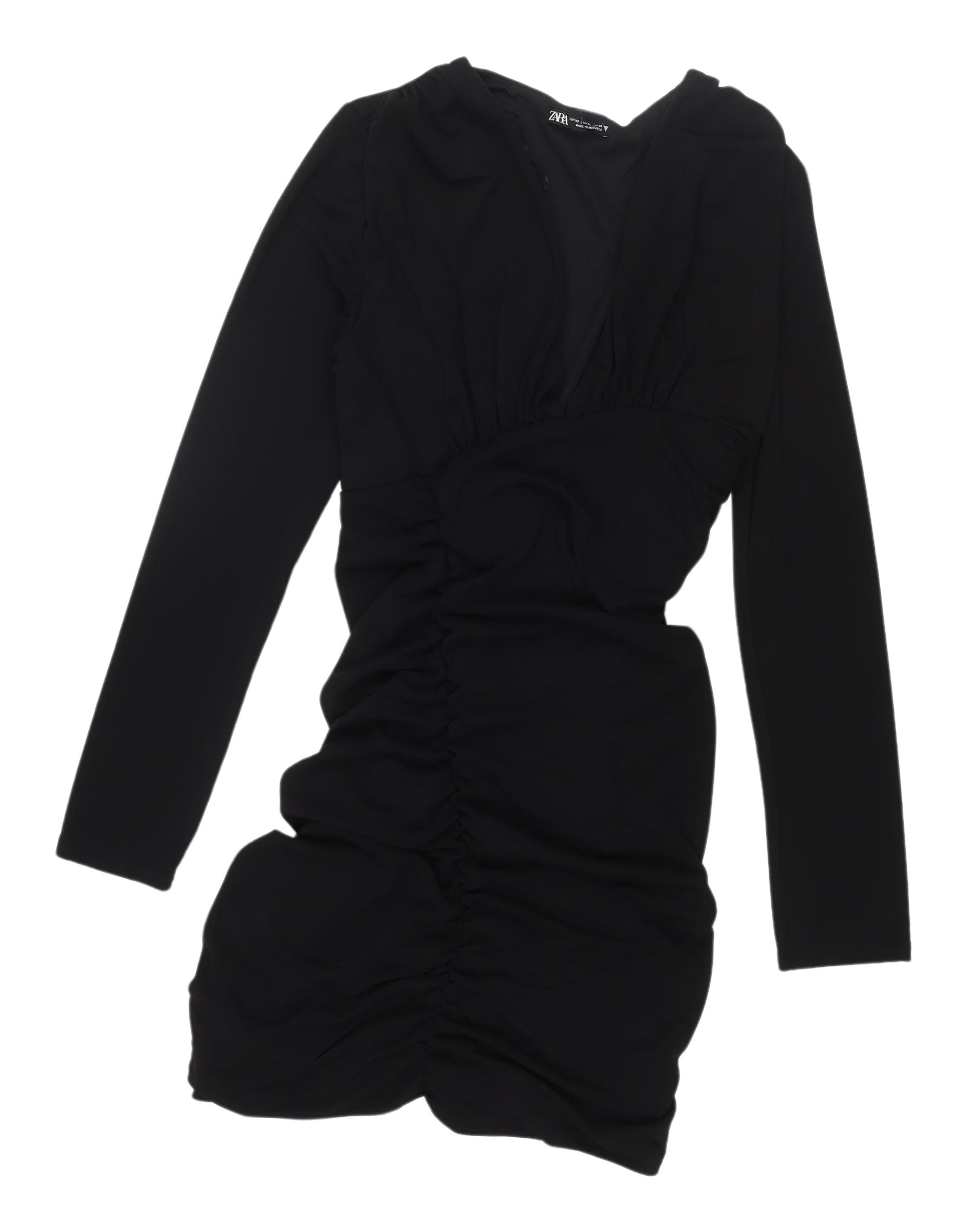 This sleek black Zara dress is the epitome of understated elegance, perfect for a night out or a sophisticated cocktail party. With its bodycon fit, this dress hugs your curves in all the right places. The ruched detailing on the front adds a touch of dimension, making this piece a standout option for chic evening wear. Designed with long sleeves and a flattering V-neckline, this dress is ideal for the cooler autumn and winter months. Crafted from 100% polyester, the jersey fabric offers both comfort and a snug fit, ensuring you look as good as you feel. This short dress is versatile enough to pair with your favourite heels and statement jewellery, making you the centre of attention at any event. The zip closure at the back allows for easy dressing, while the plain design ensures you can accessorise to your heart's content. Whether you're headed to a party or a formal dinner, this dress offers the right balance of style and comfort. As it's in excellent condition, you get quality and style combined, without any visible defects. Elevate your wardrobe with this timeless piece from Zara.