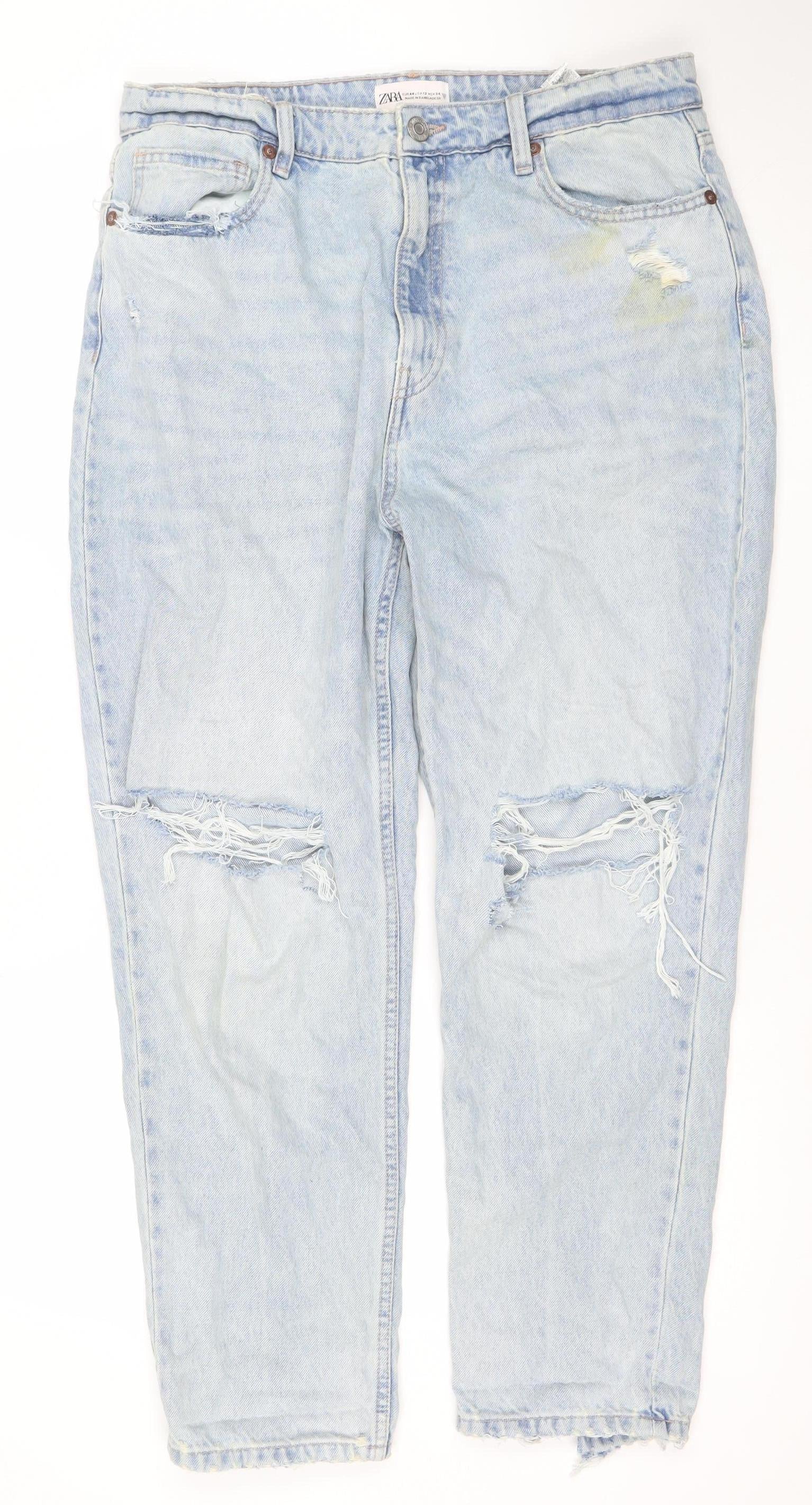 Upgrade your casual denim collection with these effortlessly stylish Zara women’s distressed boyfriend jeans in a versatile light blue wash. Made from 100% cotton, these jeans offer the breathable comfort and durable quality of classic denim while maintaining a laid-back, modern appeal. The relaxed boyfriend fit provides a comfortable silhouette, ideal for both everyday wear and weekend style. Designed with a mid rise for a naturally flattering fit, they sit perfectly on the waist and pair beautifully with anything from fitted tops to oversized tees. Featuring a 5-pocket design for practicality, these jeans also include a classic zip and button closure for secure wear. The distressed ripped detailing at the front and a slightly frayed hem add a touch of urban chic, making them a standout piece for casual styling or edgy layering. The light blue, stonewashed tone evokes a relaxed, sun-faded look, perfect for spring, summer, and autumn. Crafted in Bangladesh, the fabric’s natural cotton texture ensures easy machine washing and long-lasting wear. Condition is good, with a small, faint stain near the front pocket that does not detract from their authentic character. Whether styled with trainers and a simple tee or dressed up with heeled boots and a blazer, these jeans bring an effortlessly cool vibe to your wardrobe. Perfect for those seeking a combination of comfort and style, these Zara distressed boyfriend jeans in size 16 will quickly become a versatile favourite for off-duty days and casual outings alike.
