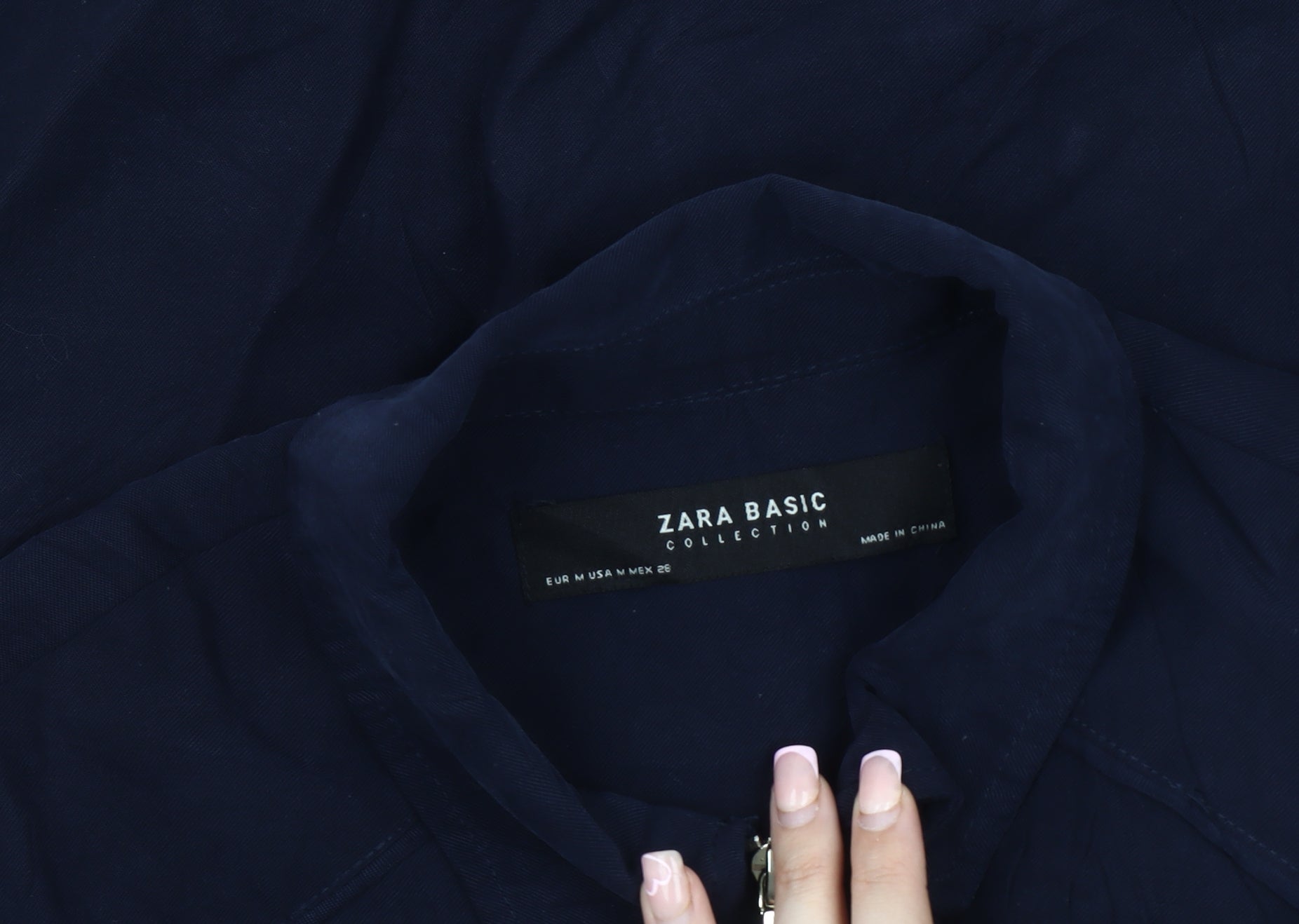 Step out in style with this elegant Zara Basic Collection jacket for women, designed to perfectly complement your everyday look. In a classic shade of blue, this mid-length jacket features a sleek zip closure and functional pockets, making it versatile enough to pair with both casual and semi-formal outfits. Crafted from a quality blend of viscose and polyester, the jacket offers a regular fit with a comfortable full sleeve design. Ideal for all seasons, its lightweight fabric ensures breathability while providing just the right amount of coverage. This jacket is in excellent pre-owned condition with no visible defects, ensuring you look your best wherever you go. Whether you're heading to a casual outing or a weekend getaway, this no-pattern jacket from Zara is a timeless addition to your wardrobe. Enjoy the combination of style and practicality without compromising on comfort. Available in size M, this jacket is perfect for everyday wear. Grab this fantastic piece today, complete with a convenient zip accent, and embrace a touch of elegance in your ensemble. Don't miss out on adding this versatile outerwear staple to your closet!