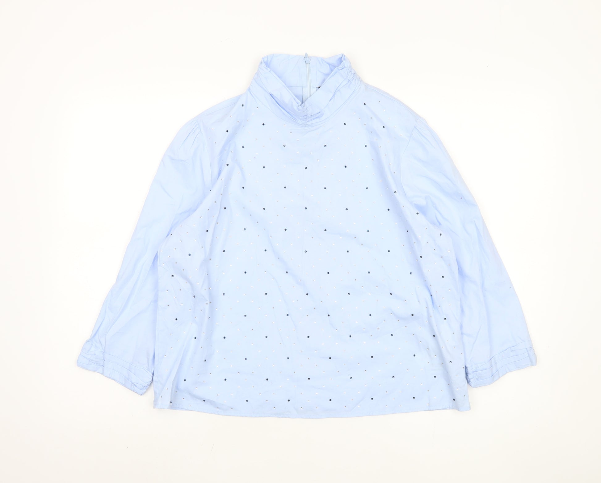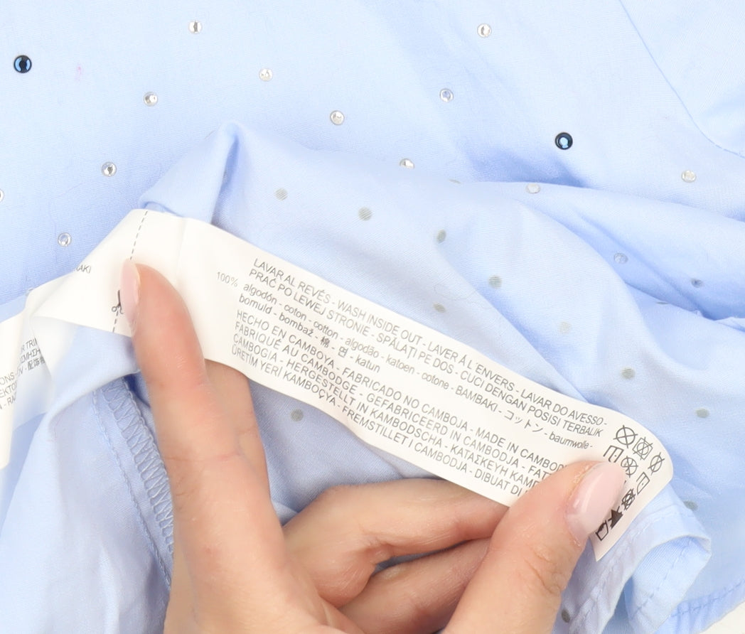 Step into elegance with this exquisite Zara Women's Blue Rhinestone Long Sleeve Top in size 12. Perfect for adding a touch of sparkle to your everyday wardrobe, this top combines sophistication with comfort. Crafted from 100% cotton, it ensures a soft and breathable fit that's ideal for the spring season. The striking rhinestone accents add a hint of glamour, making it suitable for both casual outings and more dressed-up occasions. The high neckline offers a chic silhouette, while the long sleeves provide coverage and style. Pair this blue beauty with your favourite jeans or a sleek skirt for an effortlessly stylish look. While there are some small marks visible, this top remains in very good condition, ready to become a staple piece in your collection. Machine washable for easy maintenance, it's an excellent choice for the modern woman who values fashion and functionality. Don't miss out on the opportunity to own this stylish Zara piece!