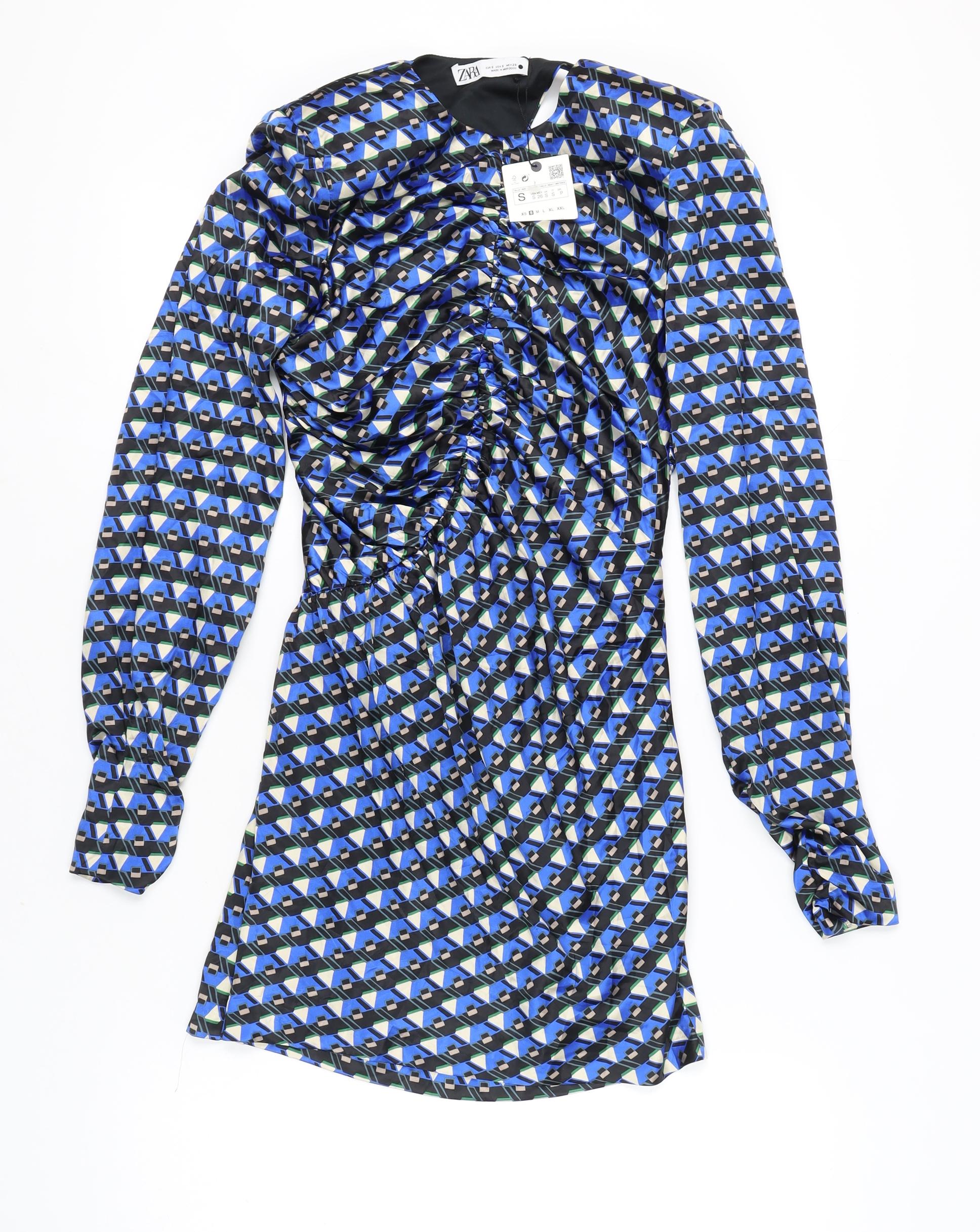 Elevate your wardrobe with this stunning Zara blue sheath dress, perfect for any casual or party occasion. Featuring a chic geometric pattern, this dress effortlessly combines style and comfort. The short length and ruched accents add a modern twist, while the lightweight polyester fabric ensures a flattering fit. With its classic round neckline and versatile long sleeves, it's ideal for transitioning through the seasons. Whether you're heading to a cocktail party or a casual outing, this dress is sure to make a statement. Don't miss out on the opportunity to add a touch of elegance to your collection.