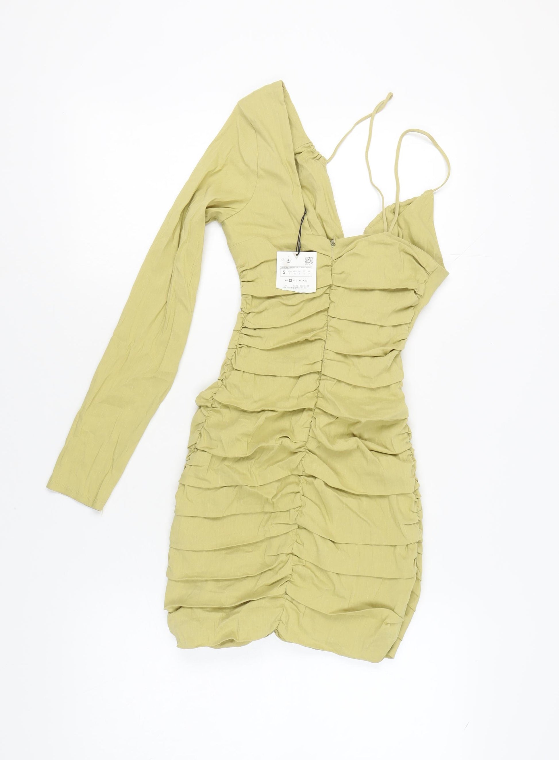 Step into the spotlight with this striking Zara Women's Bodycon Dress. Designed to make a statement, the dress boasts a captivating green hue, perfect for turning heads at your next party or cocktail event. Crafted for a sleek silhouette, this short dress fits snugly to highlight your curves. The dress features long sleeves and a unique asymmetrical design, adding a modern twist to a classic style. The V-neckline enhances its chic appeal, while the ruched accents provide a touch of elegance and sophistication. Constructed from a comfortable blend of viscose, polyamide, and elastane, this dress moves with you, ensuring both style and ease. Ideal for the warmer months, it is best suited for spring and summer occasions. With its new with tags condition, this dress is in excellent shape and ready to enhance any wardrobe. Whether it’s a night out or a special occasion, this dress promises to deliver an exceptional fit and timeless style. Don’t miss the chance to add this versatile piece to your collection and enjoy fashion-forward confidence all year round.