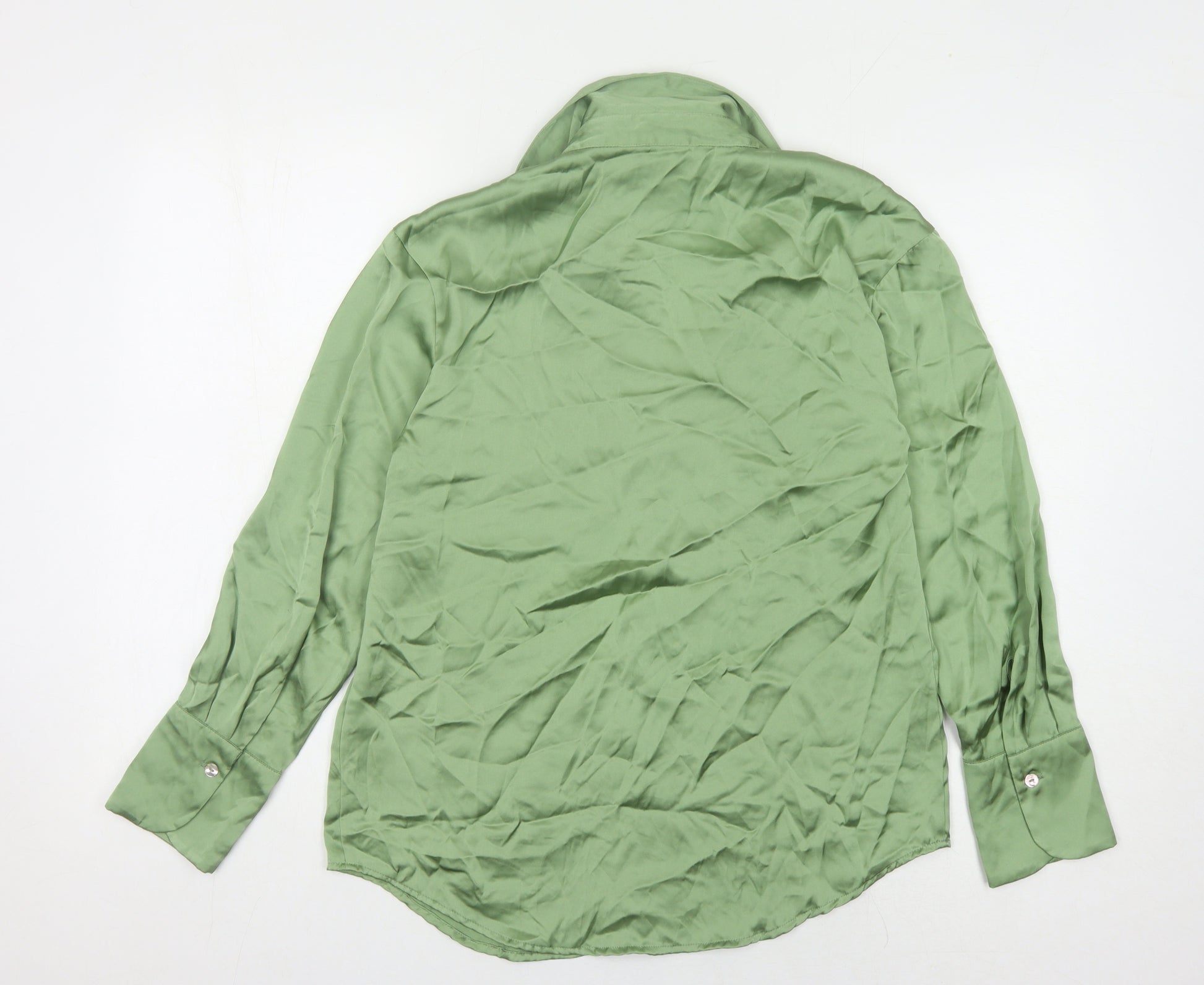 Elevate your wardrobe with this delightful Zara button-up shirt in a refreshing shade of green. Crafted from 100% polyester, this feminine top promises both comfort and durability. Its collared design exudes classic sophistication, making it an ideal choice for women seeking versatile fashion. With long sleeves that provide ample coverage, this shirt is perfect for layering under blazers or wearing solo for an effortlessly stylish look. The solid green colour adds a pop of refreshing vibrancy to any ensemble. Whether you're stepping into the office or dressing up for a casual outing, this top fits the bill. An excellent addition to your wardrobe, it complements various style preferences and allows for countless outfit combinations. Light creases add a touch of character, while its gently worn condition assures you of its reliability and quality. Embrace timeless fashion with this elegant Zara shirt—your versatile staple for any occasion.