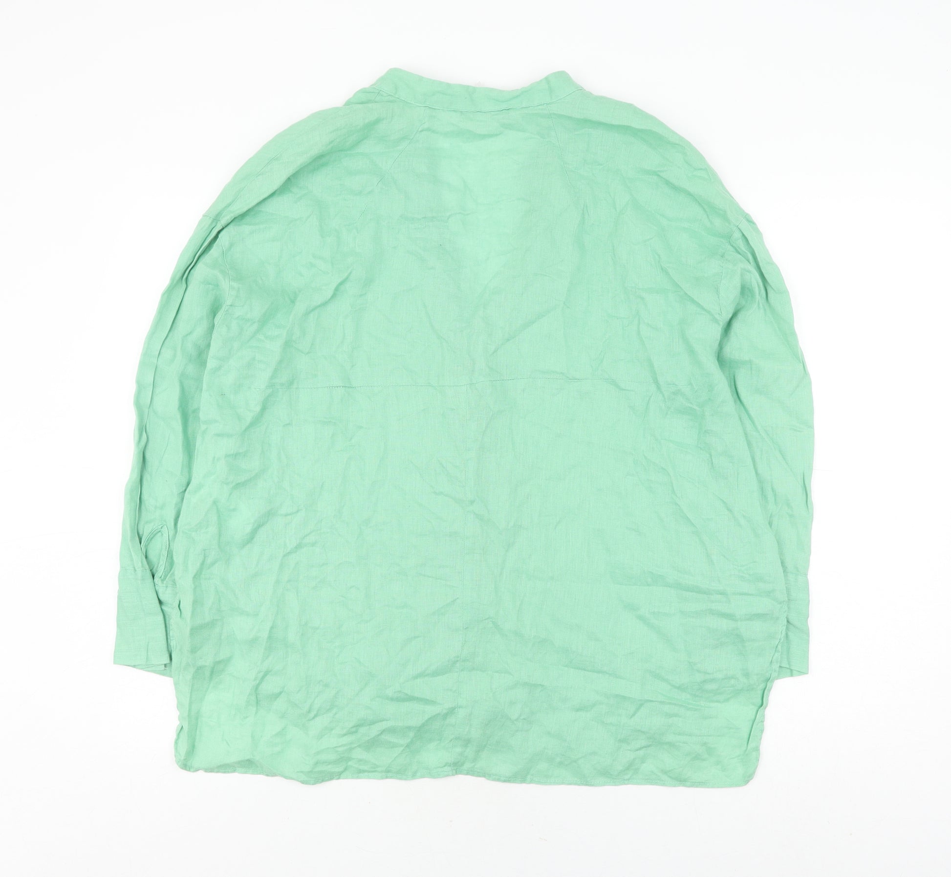 Elevate your casual wardrobe with this Zara Women's Green Linen Button-Up Shirt in size M. Perfect for the warmer Spring and Summer months, this top features a lightweight and breathable 100% linen construction, ensuring comfort throughout the day. The classic long sleeve design and V-neckline offer a flattering and versatile silhouette that pairs seamlessly with various outfits, from casual jeans to tailored skirts. The solid green colour brings a fresh and vibrant look, perfect for adding a pop of colour to your ensemble. Accented with buttons, this shirt provides a simple yet stylish closure. Whether you're heading to a casual outing or looking for a chic workwear option, this regular-fit button-up shirt is an ideal choice. Despite being gently used, it is in excellent condition, free from any visible damage, making it a reliable addition to any stylish wardrobe. Enjoy the comfort and timeless appeal of a Zara classic, suited for multiple casual occasions. Don't miss out on this versatile piece, tailored for those who appreciate style and comfort in one package.