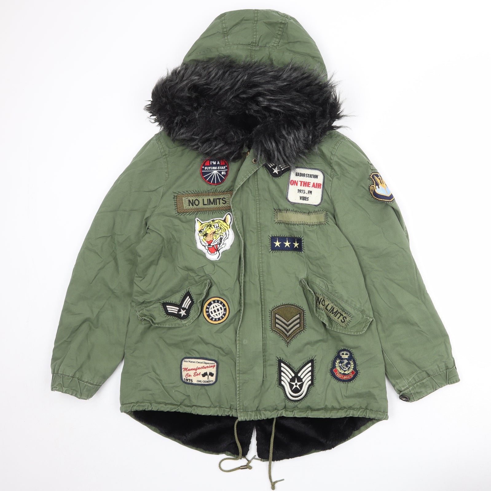 Womens Green Parka Coat Size M Zip - Patch Work Detail