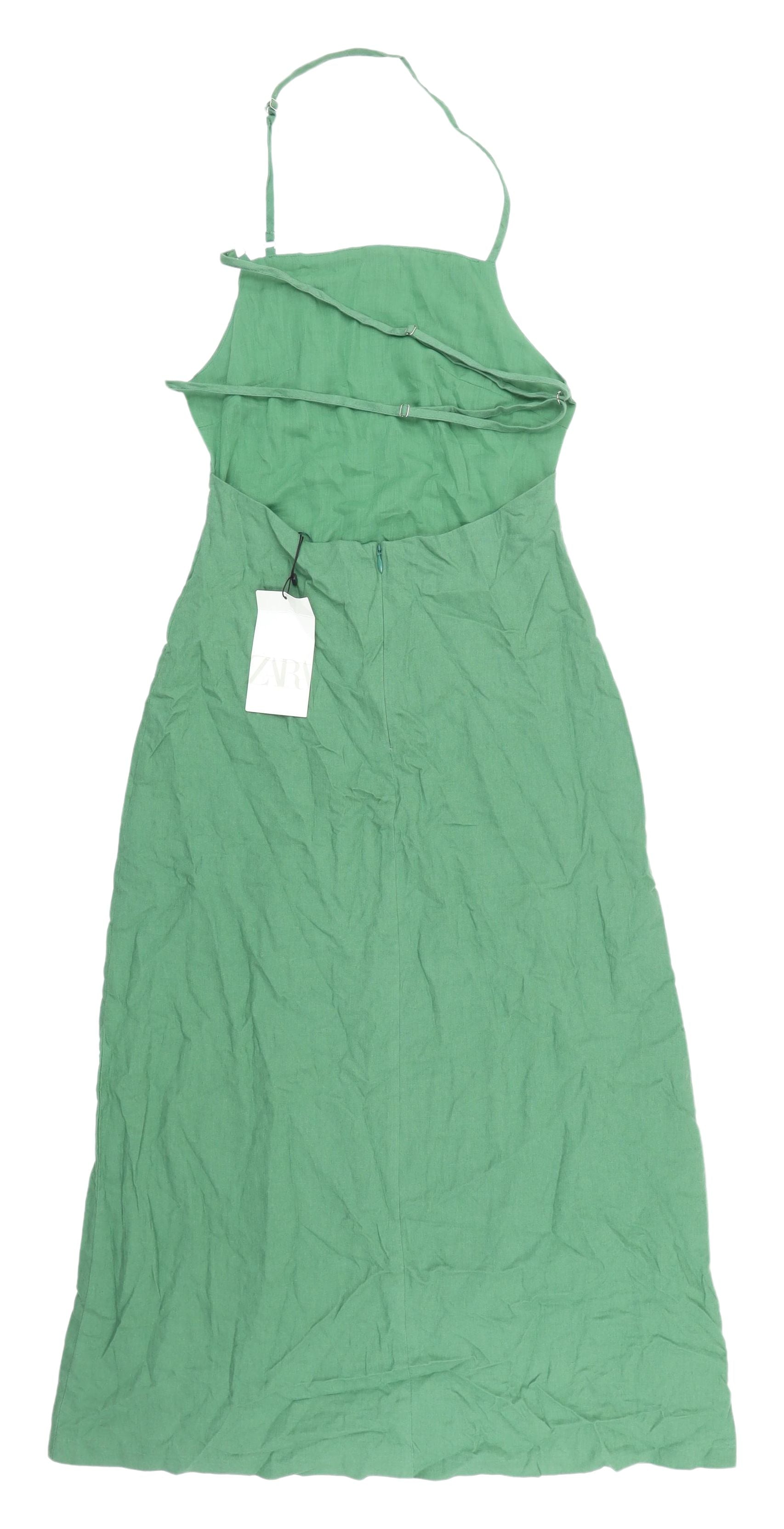 Step into the spotlight with this sophisticated green slip dress from Zara. Perfect for summer, this midi-length dress exudes elegance and effortless style. Made from a soft blend of linen and polyester, it offers both comfort and a lightweight feel, ideal for warmer weather. The dress features a classic scoop neckline and adjustable strappy sleeves, making it versatile for both casual outings and cocktail parties. Its minimalist design ensures you stand out in any setting, while the sleek zip closure at the back adds a touch of modernity. Whether you're heading to a garden party or a casual day at the beach, this green slip dress is your new go-to. Embrace the essence of summer fashion with confidence and flair.