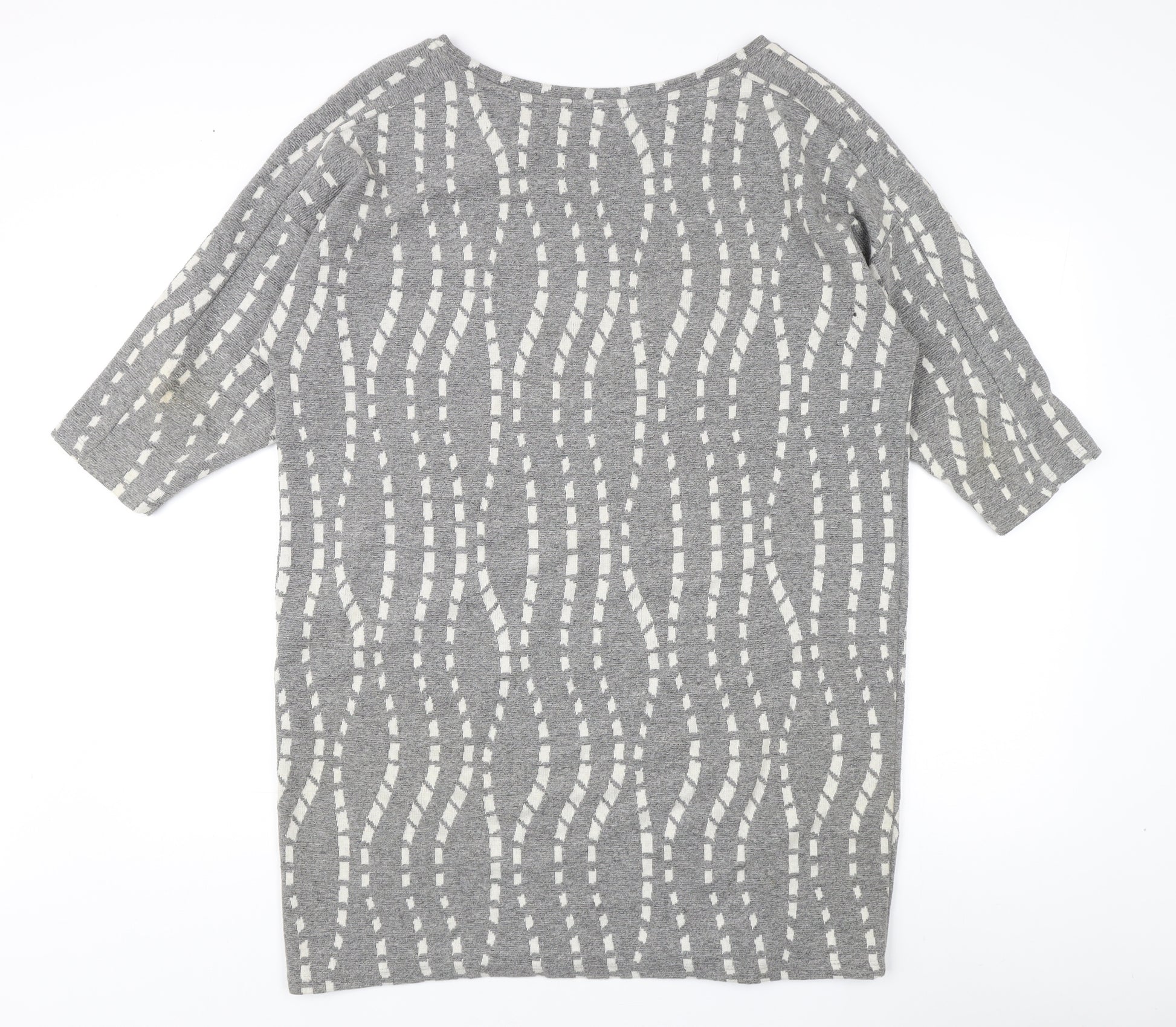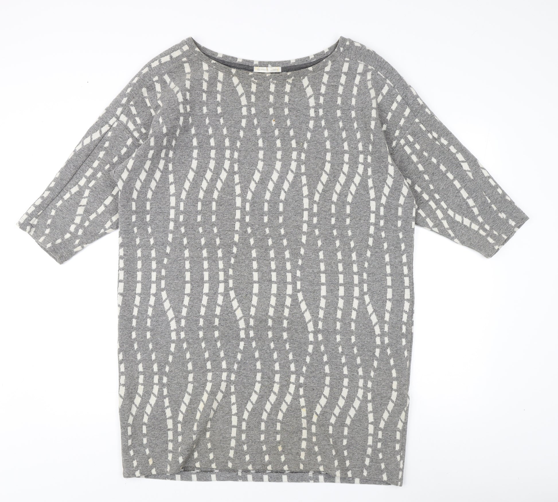 This elegant Zara pullover jumper is a stylish addition to any wardrobe. Crafted for women, the jumper features a sophisticated geometric pattern in versatile grey, making it perfect for the autumn season. Designed with a comfortable boat neck and a relaxed 3/4 sleeve length, this jumper promises to combine ease and fashion effortlessly.Made from a cotton blend material, it offers a soft, breathable fit, ideal for casual occasions. The knit fabric ensures additional warmth as the temperatures drop. While the condition is excellent, a small stain is visible, which is typical for gently used clothing. However, with machine washable convenience, maintaining its appearance is hassle-free.Ideal for pairing with jeans or smart trousers, its versatile design makes it suitable for a range of fashionable looks. The pullover style allows easy wear, complemented by a regular fit that flatters many body types. Find your perfect choice for a classic wardrobe update with this Zara jumper.