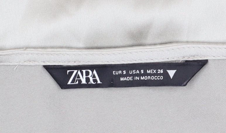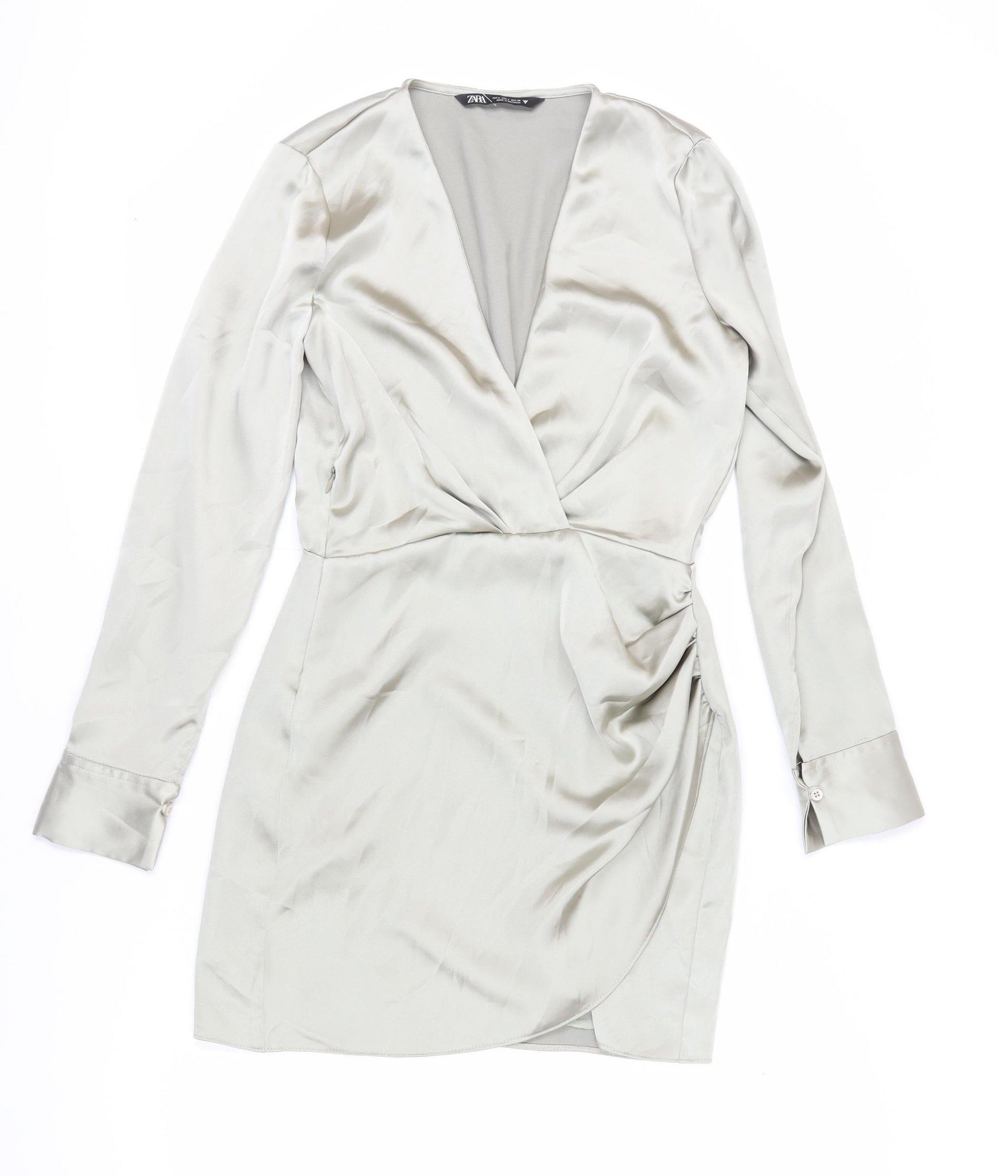 Elevate your wardrobe with this elegant Zara wrap dress, perfect for any sophisticated event or evening out. Crafted from luxurious, smooth satin fabric, this grey wrap dress offers an exceptionally flattering fit that drapes beautifully over the body. The dress features a stylish V-neckline, complemented by long sleeves that provide an extra touch of elegance. It is designed in a comfortable size 'S', suitable for regular sizing. With a short dress length, it can make a chic statement whether worn for a cocktail party or a formal gathering. The dress, with its simple yet graceful design, utilizes a zip closure for secure fitting and ease of wear. It's predominantly made of high-quality polyester, ensuring durability while maintaining a soft and comfortable touch against the skin. Although in very good condition, it does have minor marks on the fabric, a small compromise for its overall appeal. Ready to shine during the Autumn or Winter seasons, this dress brings versatility and style to any wardrobe. Treat yourself to exquisite attire that's sure to turn heads and accentuate your personal style with a polished finish.