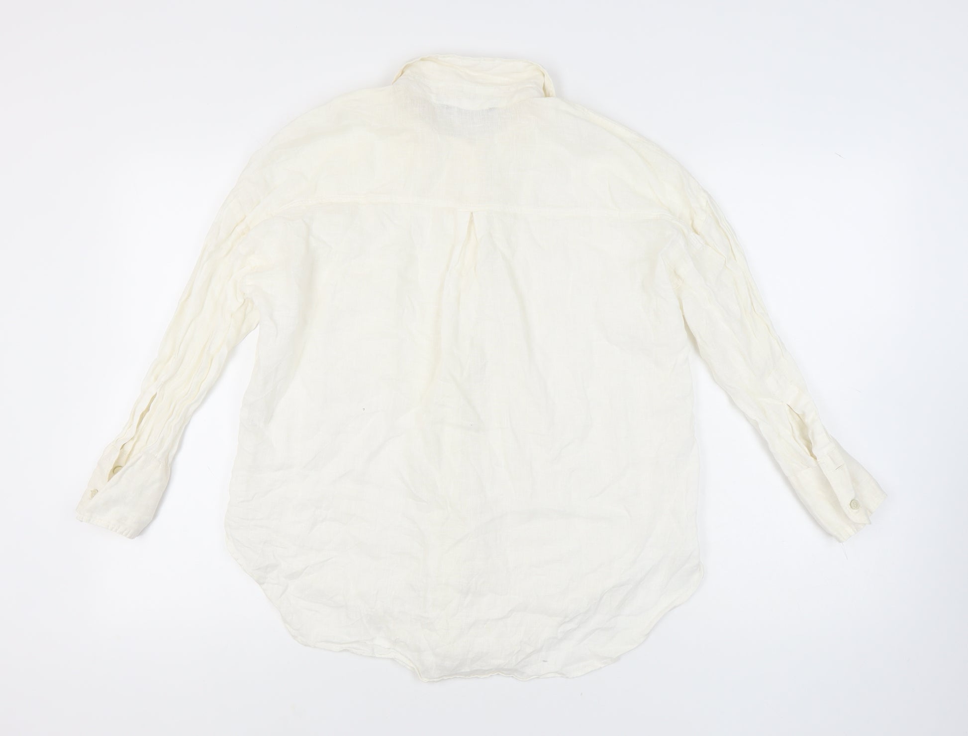 Step up your casual wear with this elegant ivory button-up shirt from Zara, perfectly suited for today's modern woman. Crafted from 100% linen, this shirt captures the essence of summer fashion with its breathable and lightweight material. Designed with a classic collared neckline and long sleeves, it offers a touch of refinement while ensuring maximum comfort. The solid ivory colour provides a versatile base, making it an ideal choice for pairing with various outfit combinations. Whether dressing up for a casual outing or adding a sophisticated layer to your ensemble, this shirt effortlessly blends simplicity with style. Its regular fit and classic sleeve offer a polished appearance, ensuring it's not just functional but chic as well. Embrace the timeless appeal of linen with this must-have addition to your wardrobe, promising both quality and aesthetic charm.