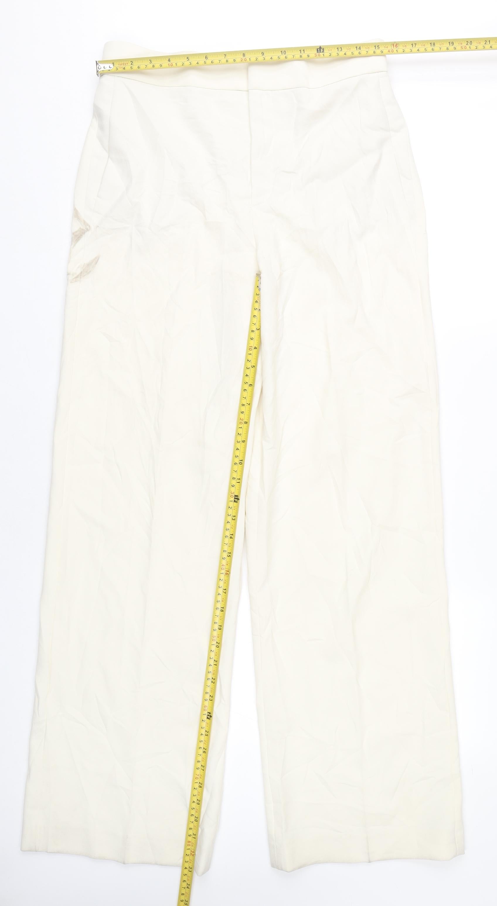 Step into elegance with these Zara Women's Ivory Straight Trousers in Size 12, perfect for adding a touch of class to any outfit. Crafted from a premium blend of polyester, viscose, and elastane, these trousers offer not only a luxurious look but also a comfortable fit. The material blend ensures durability and ease of maintenance while giving a soft feel against the skin. Ideal for both business and casual settings, these trousers are designed with a classic straight leg style that flatters and elongates the silhouette. The trouser's ivory colour adds a sophisticated touch that can be paired with a variety of tops and shoes for versatile styling options. With a focus on practicality, these trousers come equipped with pockets, ensuring you have convenient storage options for your essentials. The mid-rise fit is comfortable and stylish, making them suitable for all-day wear. Perfect for the spring and summer seasons, these trousers are machine washable, ensuring easy care and longevity. New with tags, they are an excellent addition to your wardrobe, offering a modern yet timeless design. Whether you're stepping into the office or going out for a casual day, these trousers from Zara promise to make you look and feel spectacular. Grab them now at an affordable price.
