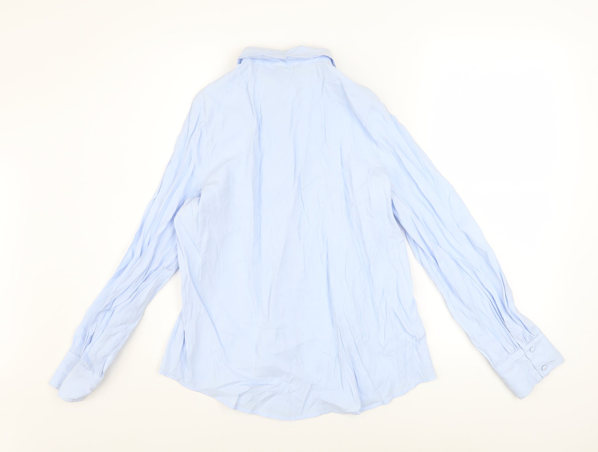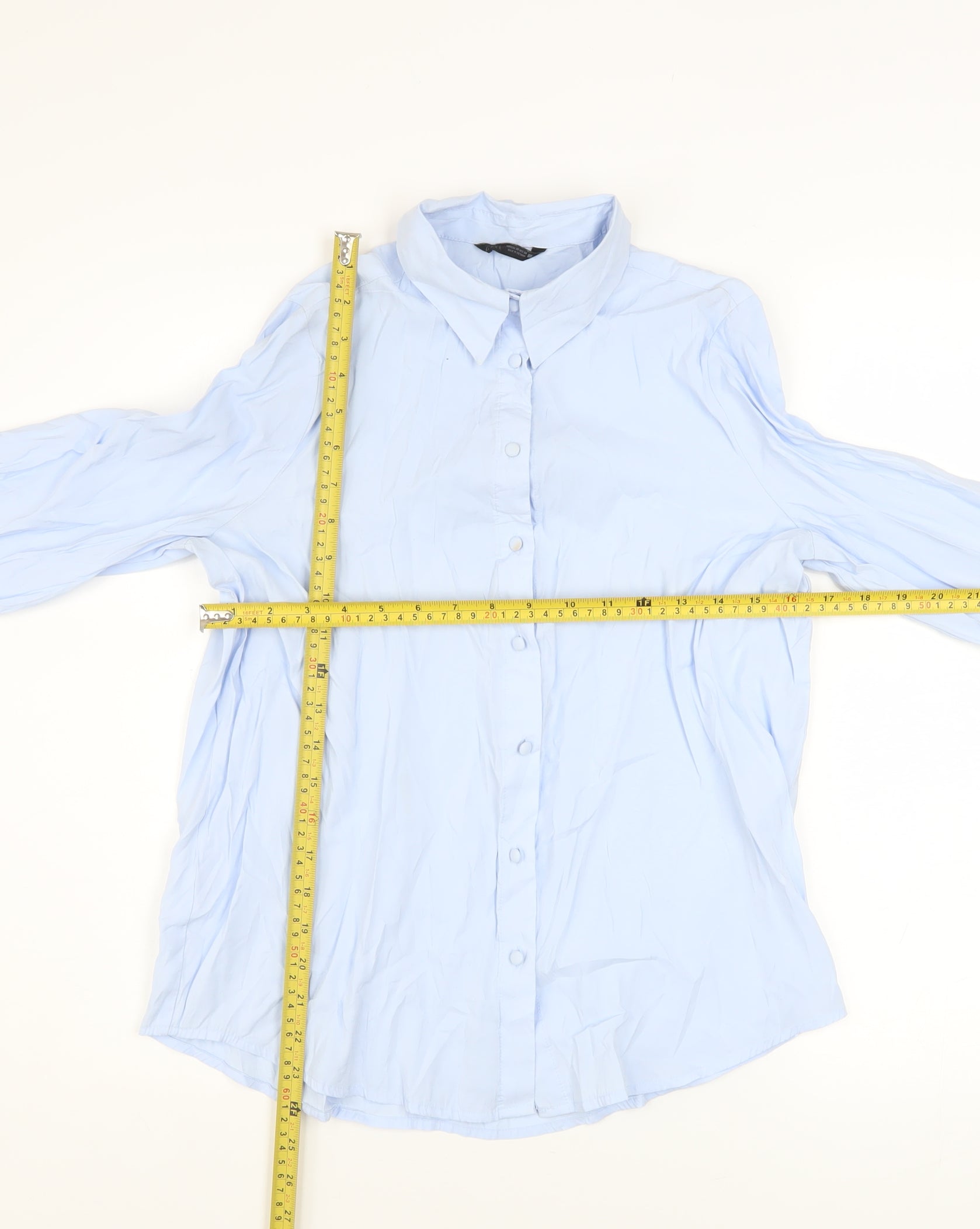 Elevate your wardrobe with this effortlessly chic light blue button-up shirt from Zara, designed for women who appreciate timeless classics with a modern edge. Crafted from soft, breathable fabric that provides all-day comfort, this shirt features a crisp collared neckline and long sleeves with button cuffs, offering a polished silhouette that can be dressed up or down. The light pastel blue tone adds a refreshing, airy touch — ideal for the office, weekend outings or elegant layering under blazers and knitwear during cooler months. The flattering cut and versatile style make this shirt a wardrobe essential suitable for both professional and casual occasions. Pair it with tailored trousers for a business look or jeans for an easy casual ensemble. Though pre-loved, it remains in excellent condition with minimal signs of wear, ensuring both durability and continued style appeal. The shirt’s high-quality craftsmanship and minimalist design echo Zara’s popular reputation for delivering fashion-forward pieces at accessible prices. This long-sleeve button-up blouse is perfect for multiple seasons — from spring through autumn — allowing great flexibility in outfit choices. Its lightweight material and breathable nature ensure comfort, while the clean, structured aesthetic complements various wardrobe staples. Whether you're rejuvenating your workwear or simply seeking a refined everyday piece, this Zara top will make a sophisticated addition to your clothing rotation. A true classic that blends comfort, elegance and practicality effortlessly.