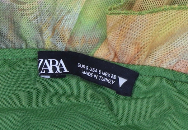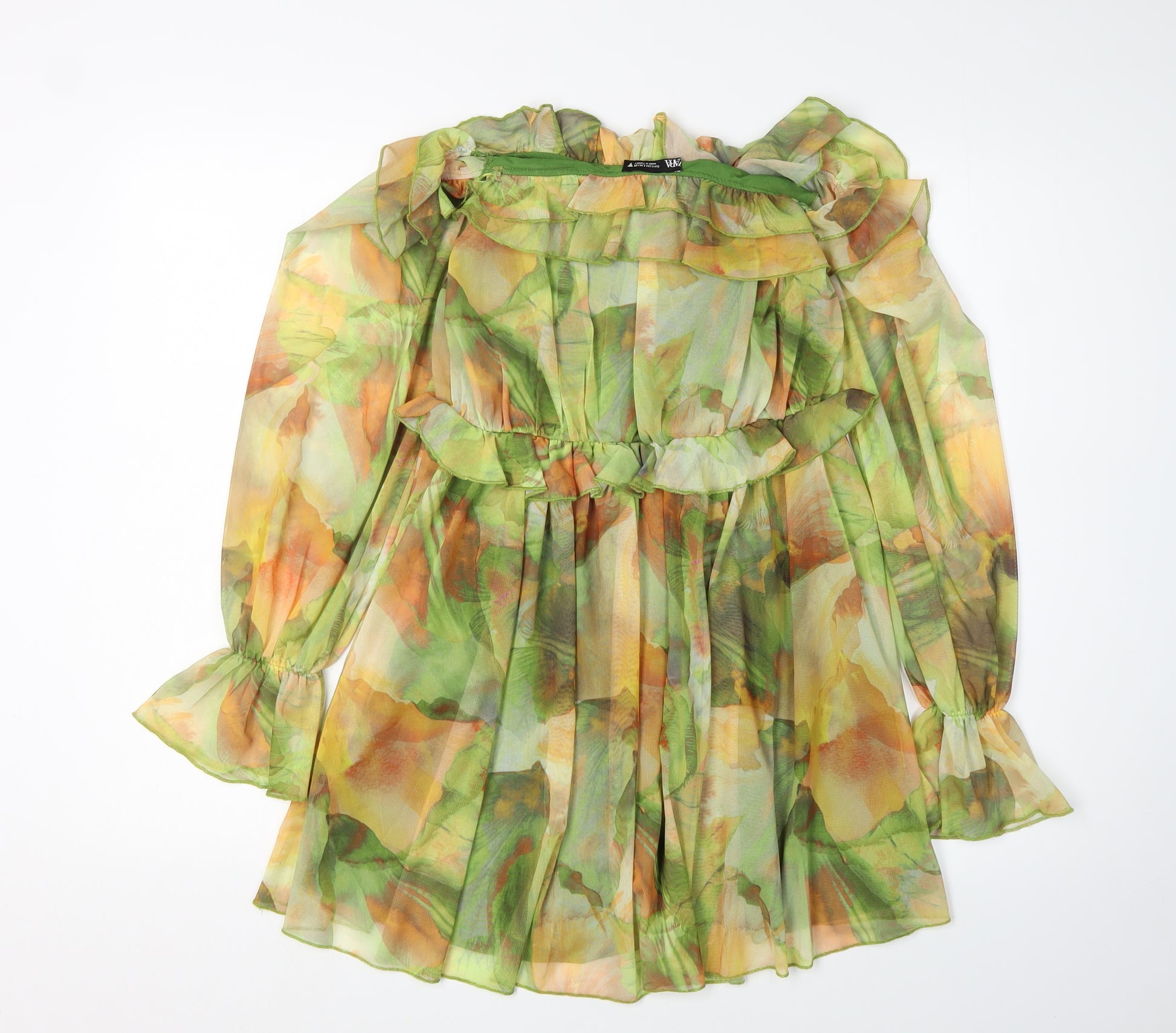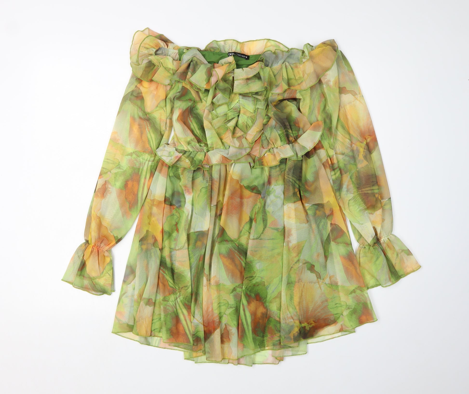 Step into the spotlight with this stunning Zara Women's Multicoloured A-Line Mini Dress, perfect for spring and summer events. This dress boasts vibrant floral patterns set on a lightweight chiffon fabric, ensuring a breezy, comfortable fit. Its eye-catching off-the-shoulder neckline and flared sleeves add a bohemian touch, making it the ideal choice for parties and cocktail gatherings. The dress features a pullover design for convenience, complemented by playful ruffle accents that enhance its feminine charm. Made from a blend of polyester and elastane, it offers a mix of durability and stretch for a flattering fit. This stylish piece is machine washable for easy care and is in excellent condition, with no visible signs of wear. Perfect for those who love bold, floral elegance, this dress is sure to become a favourite in your wardrobe.