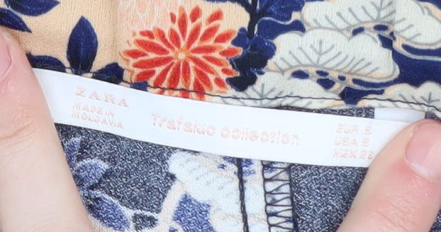 Step out in style with these chic Zara trousers, featuring a stunning multicoloured floral pattern that's perfect for adding a pop of colour to your spring and summer wardrobe. Designed for women, these cropped trousers offer a regular fit with a straight leg style, ideal for casual outings or a stylish party ensemble. Crafted from 100% polyester, these trousers ensure comfort and durability while being easy to maintain with machine-washable care. The mid-rise design, coupled with a playful pleated front, enhances your silhouette beautifully. With a secure button closure, these trousers provide both style and convenience. Despite being pre-owned, they are in excellent condition, showing no visible flaws or wear. Elevate your look effortlessly and embrace the flair of floral fashion with these vibrant yet sophisticated trousers from Zara's Trafaluc collection.