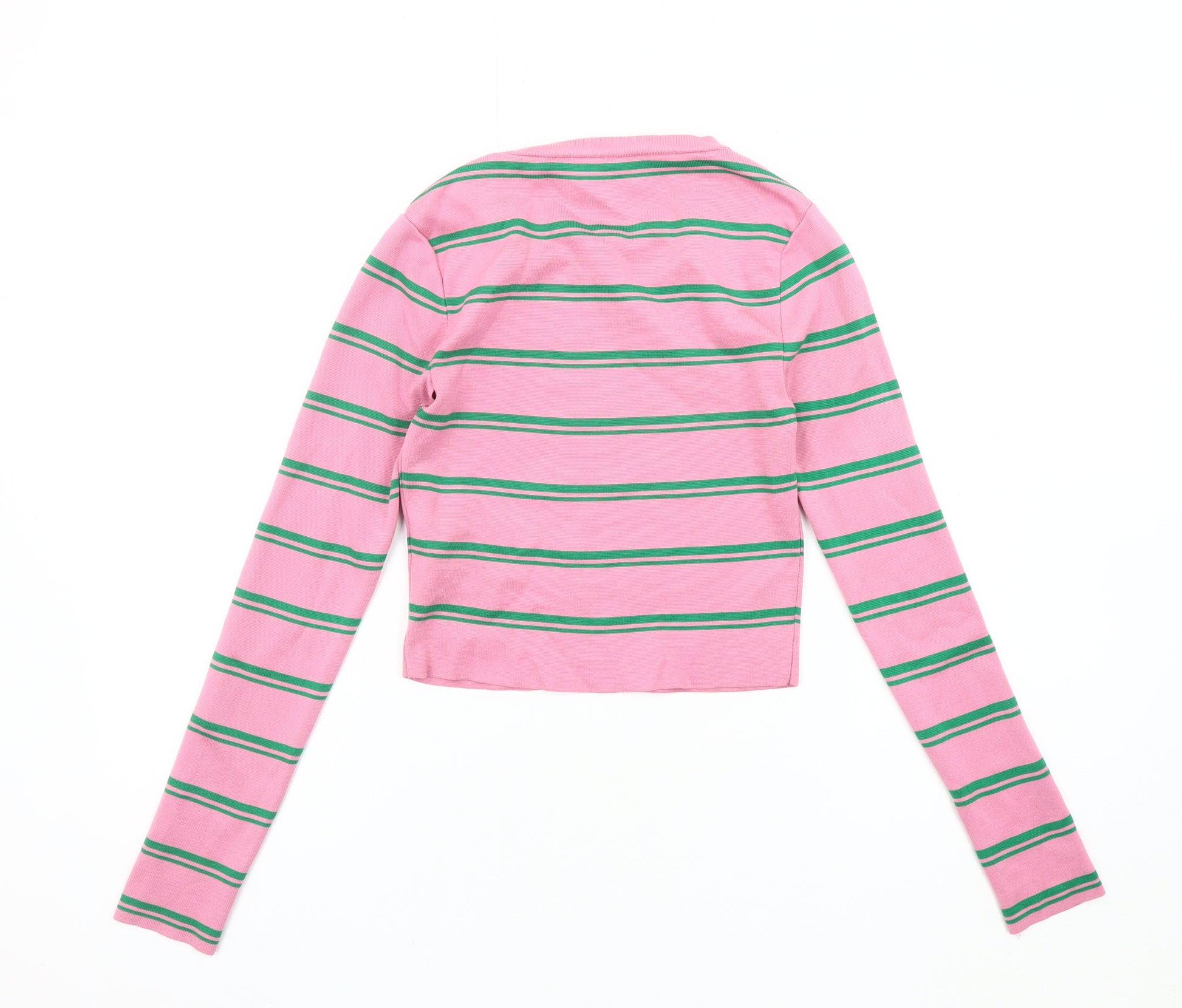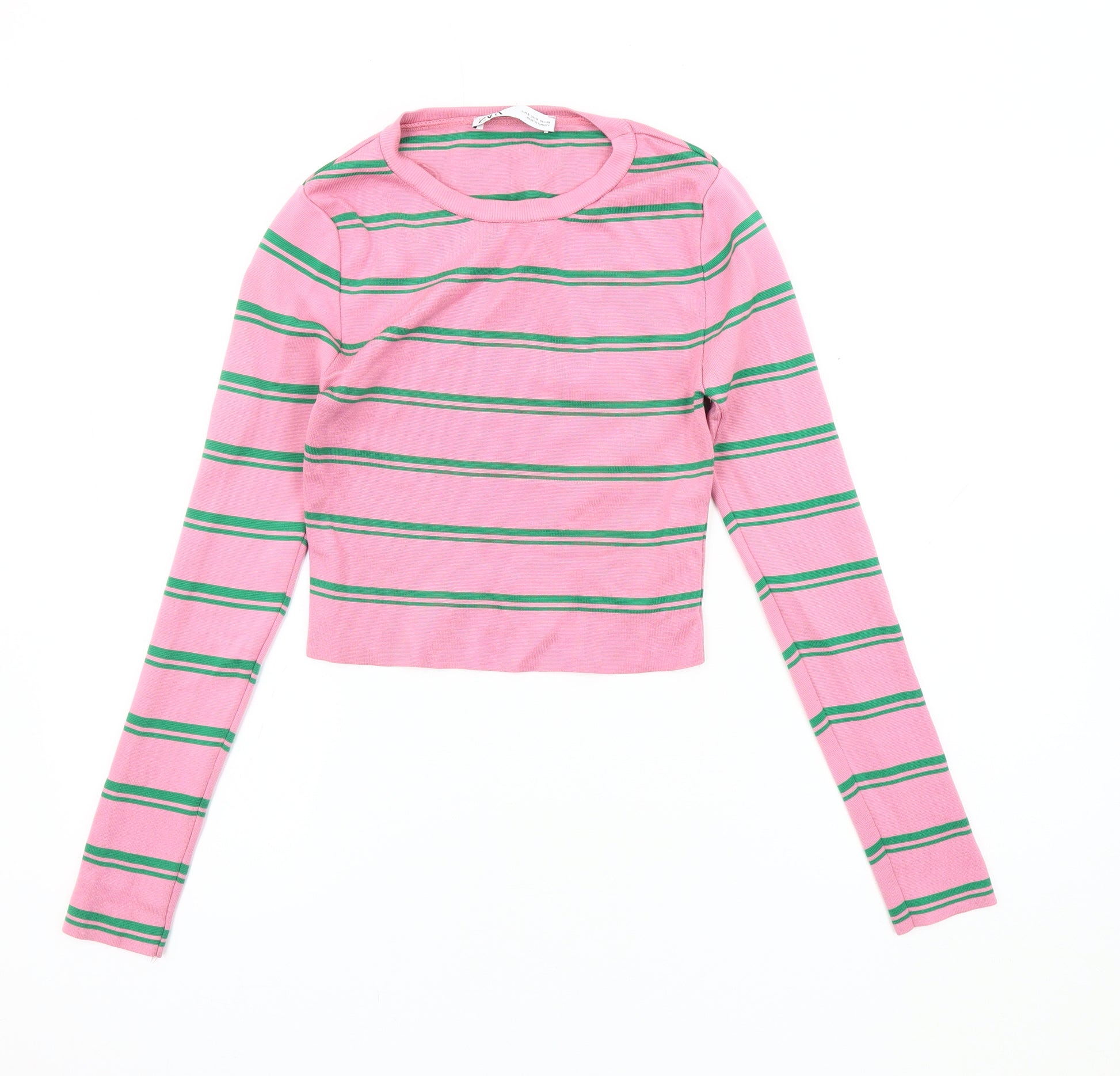 Discover a chic addition to your casual wardrobe with this slim fit cropped T-shirt from Zara, designed for women who love stylish comfort. Adorned in a playful pink shade with green stripes, it exudes a youthful charm perfect for spring and summer outings. The long sleeves and crew neckline provide a classic appeal, while the regular size ensures it complements your figure gracefully. Crafted from soft cotton jersey, this top combines breathable comfort with easy maintenance. Whether for a casual day out or a relaxed get-together, this pullover tee pairs seamlessly with jeans or a skirt for effortless style.