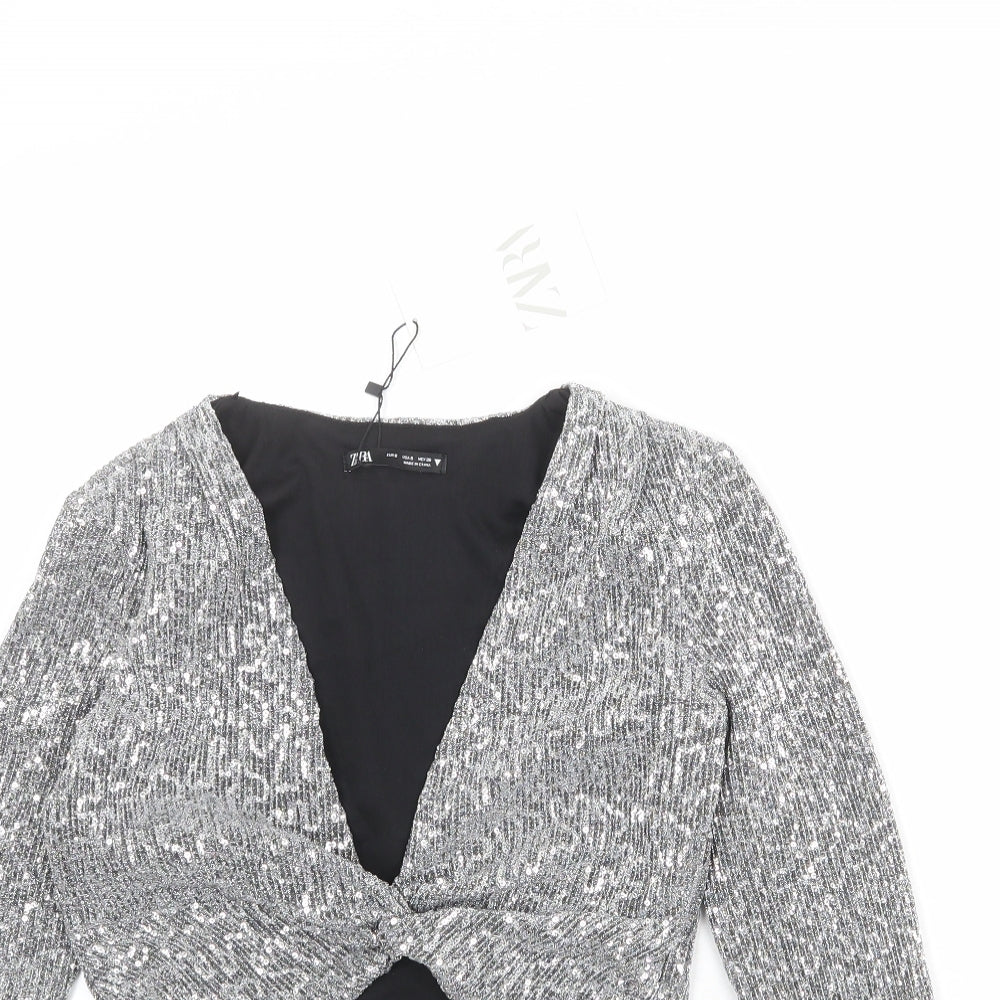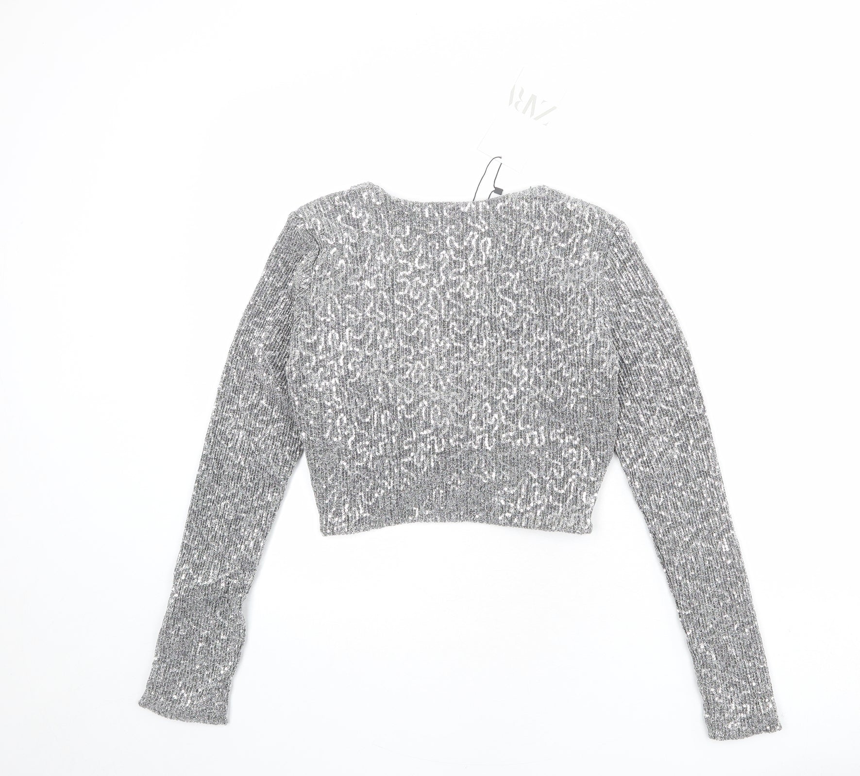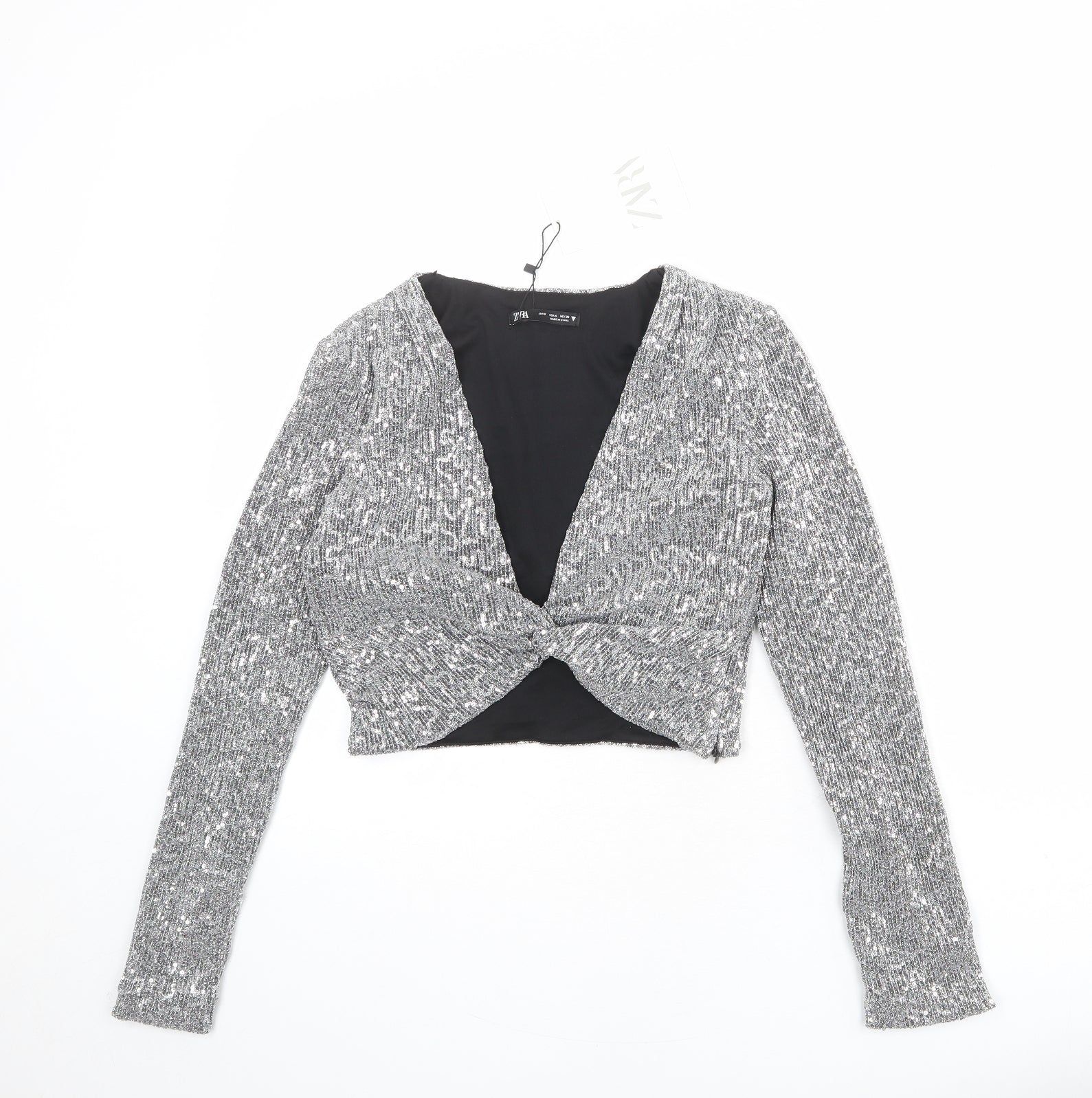 Womens Silver Polyester Cropped Blouse Size S V-Neck