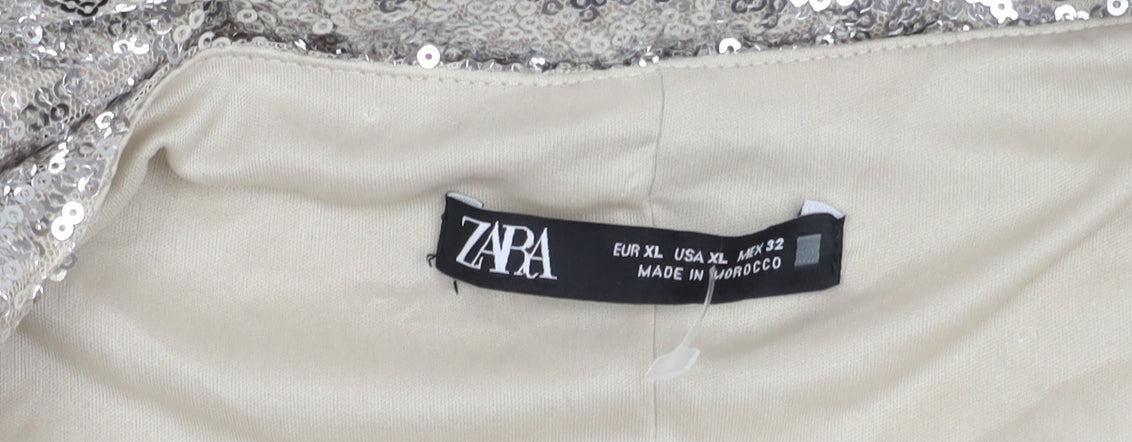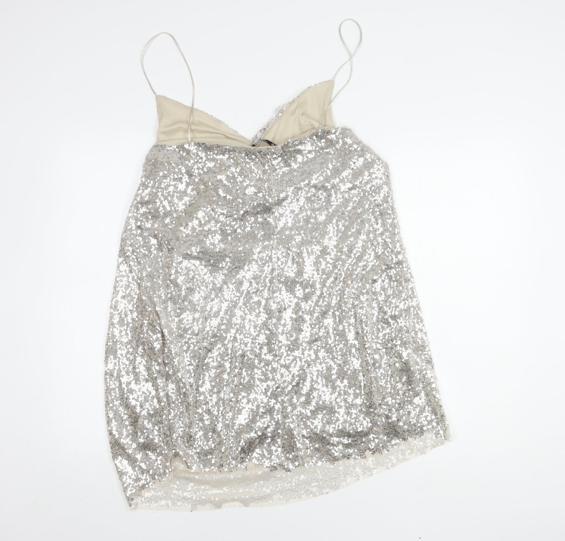 Step into the spotlight with this dazzling Zara Women's Silver Slip Dress, an ideal choice for any party or cocktail event. Crafted with sequins that shimmer with every move, this dress embodies a blend of glamour and sophistication. The sleeveless design and strappy sleeves give it a contemporary look, while the V-neckline adds a touch of elegance. Made for women who love to stand out, this dress is perfect for making a statement at any social gathering. With a regular size type and no visible wear or stains, the condition is pristine, ensuring you shine with confidence. Embrace the night with Zara’s expert craftsmanship in this new with tags piece that promises to turn heads and capture attention wherever you go. Get ready to impress with this eye-catching silver sequin masterpiece.
