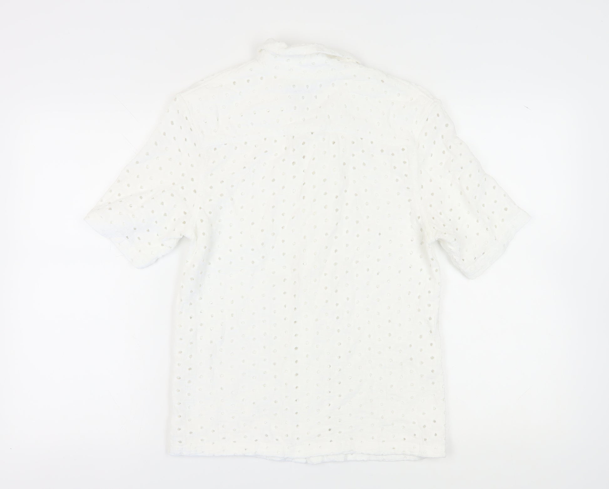 Enhance your wardrobe with this stylish white button-up shirt from Zara, crafted for the modern woman with a keen sense of style. Perfect for casual occasions, this short-sleeve shirt features a classic collar and a solid pattern, making it an ideal choice for versatile pairings. The shirt is designed in a regular size fit, suitable for those seeking comfort without compromising on fashion. Made from quality cotton, this piece promises durability and ease of care with its machine-washable feature. The button closure ensures a neat look, while the classic/fitted sleeve adds a touch of sophistication to your ensemble. Whether you're heading to a casual outing or just embracing an everyday casual vibe, this Zara shirt offers both comfort and style. In excellent condition, it shows minimal signs of wear, making it a valuable addition to your collection at an affordable price of £12.50. Don't miss the chance to own this versatile and trendy piece from a brand renowned for its chic, contemporary fashion.