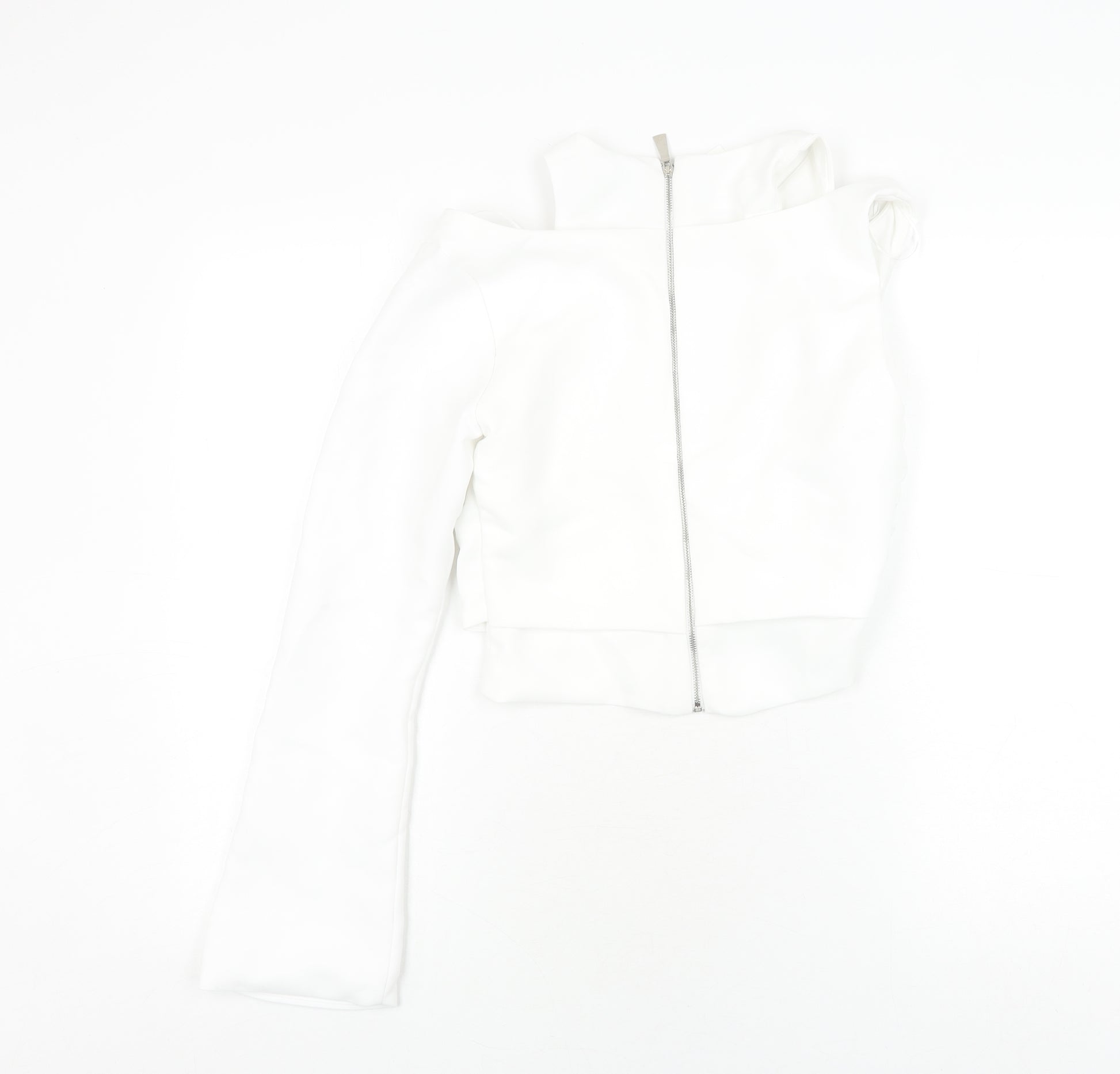 Elevate your wardrobe with this stylish Zara cropped top, designed for the modern woman seeking a contemporary look. This white top stands out with its unique off-the-shoulder neckline, adding a touch of allure to your attire. Perfect for various occasions, this piece can seamlessly transition from day to night. The asymmetric long sleeve creates a distinctive silhouette, making a bold statement. Crafted from high-quality polyester, this top ensures a comfortable fit while maintaining its shape, promising durability and long-lasting wear. The solid white colour offers a versatile aesthetic, allowing you to pair it effortlessly with any bottoms, whether it's high-waisted jeans for a casual outing or a sleek skirt for a more dressed-up ensemble. Featuring a full zip closure at the back, this Zara top ensures ease of wear, adding a practical edge to its chic design. Its cropped cut accentuates your figure, offering a flattering fit that enhances your style quotient. Ideal for women who appreciate the blend of comfort and fashion-forward designs, this top is a wardrobe essential. Whether you're heading out for a brunch with friends or a night out, this versatile piece caters to your fashion needs. With its impeccable condition noted as new with tags, this top promises not just a fashionable look but also the assurance of quality. Invest in this chic Zara cropped top and enrich your collection with a piece that embodies elegance and modern style. Available in size 12, it's the ideal choice for those who favour a polished yet contemporary look. Make this Zara top a staple in your wardrobe and enjoy the effortless style it brings to your everyday ensembles.
