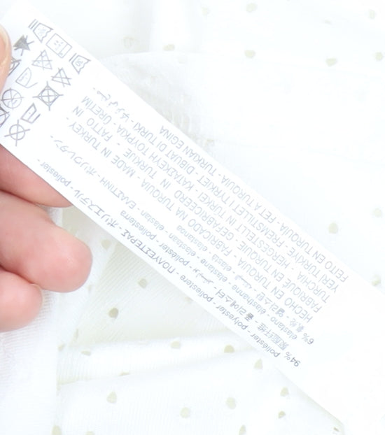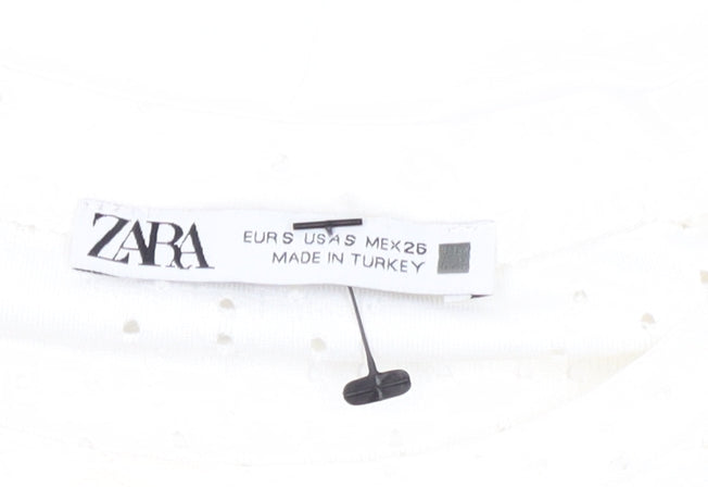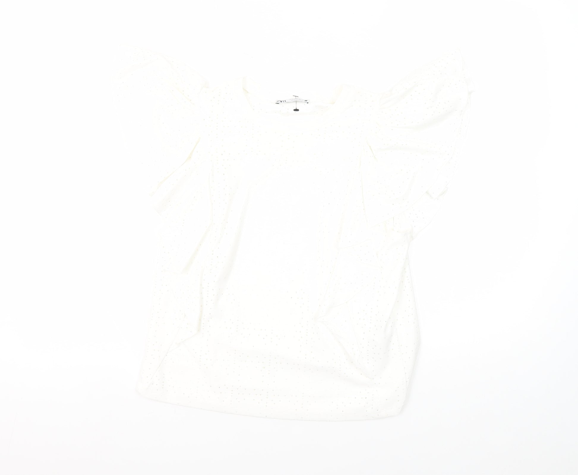 Enhance your wardrobe with this effortlessly chic Zara Women's White Polka Dot Blouse. Perfectly tailored in a size S, this regular fit blouse is a stylish addition to any outfit. Designed with a classic polka dot pattern, it features flutter sleeves for a touch of elegance and is crafted from a soft blend of polyester and elastane, ensuring both comfort and ease of movement. The simple pullover style makes it ideal for casual summer wear, while the clean white colour offers versatile pairing options. Machine washable for easy care, this blouse is in excellent condition, appearing gently used with no visible flaws. Its understated design makes it a staple for everyday wear, while still offering a playful twist with its dotted detail. Whether paired with jeans for a relaxed outing or dressed up with a skirt for a chic look, this blouse is sure to become a favourite go-to piece.