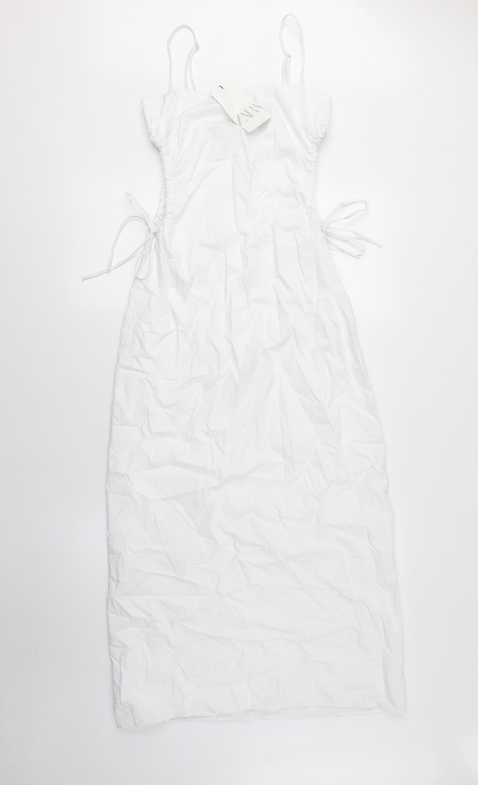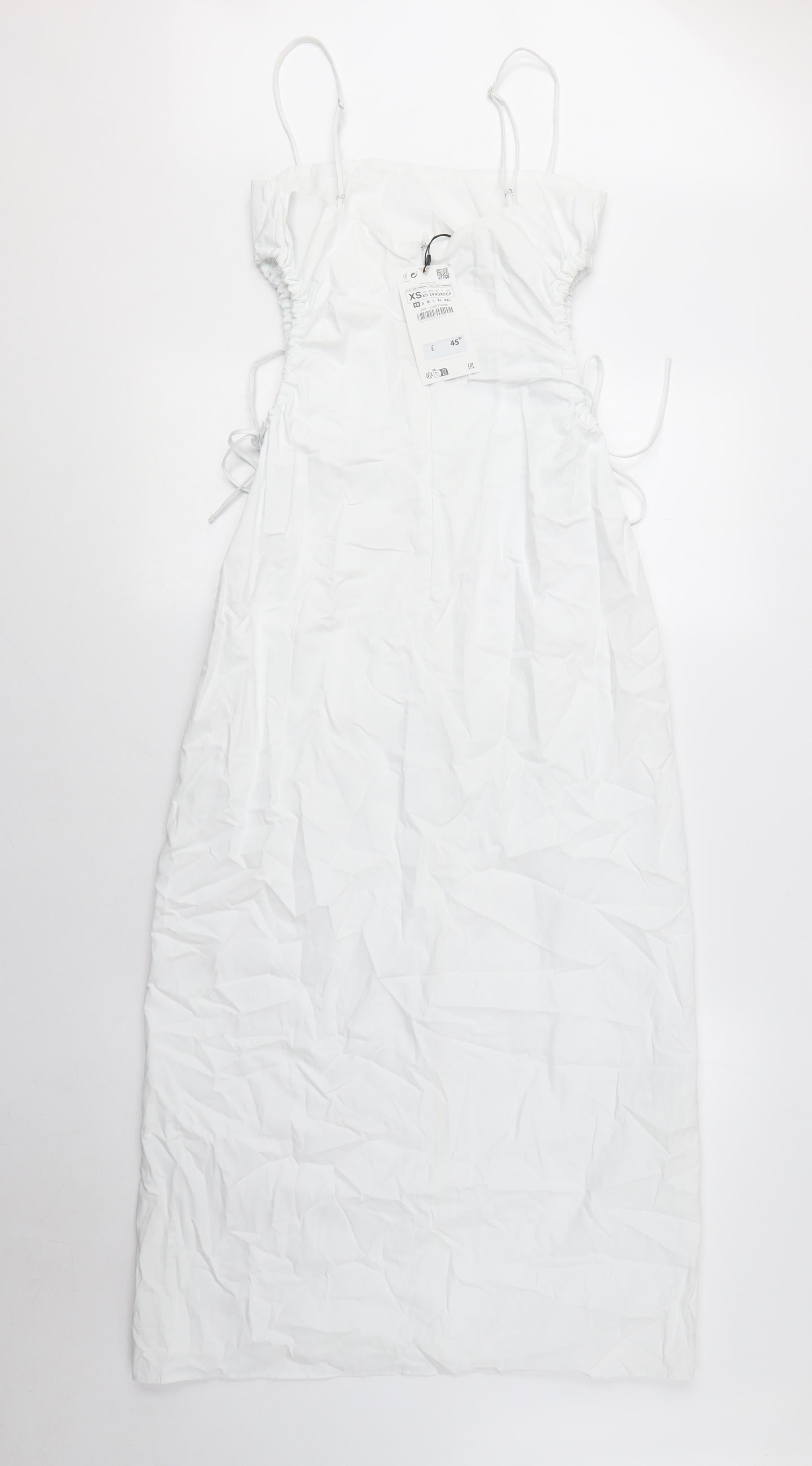 Add elegance to your wardrobe with this Zara Women's Slip Dress. Perfect for casual outings or cocktail parties, this dress in pure white exudes charm and sophistication. Its sleek design with a square neckline and sleeveless, strappy sleeves makes it ideal for summer. Accentuated with ruched sides and adjustable ties for a custom fit, this dress provides both comfort and style. Crafted from a woven fabric blend with a high cotton content, it promises a lightweight feel and breathable wear. Ideal for any summer event, its no-pattern simplicity allows easy pairing with accessories of your choice. Maintain its fresh look with ease, as this dress is machine washable. Whether you're out for an afternoon walk or attending a casual garden party, this versatile piece is set to impress. With new tags, it's the perfect addition to your collection.