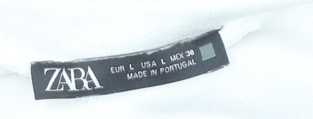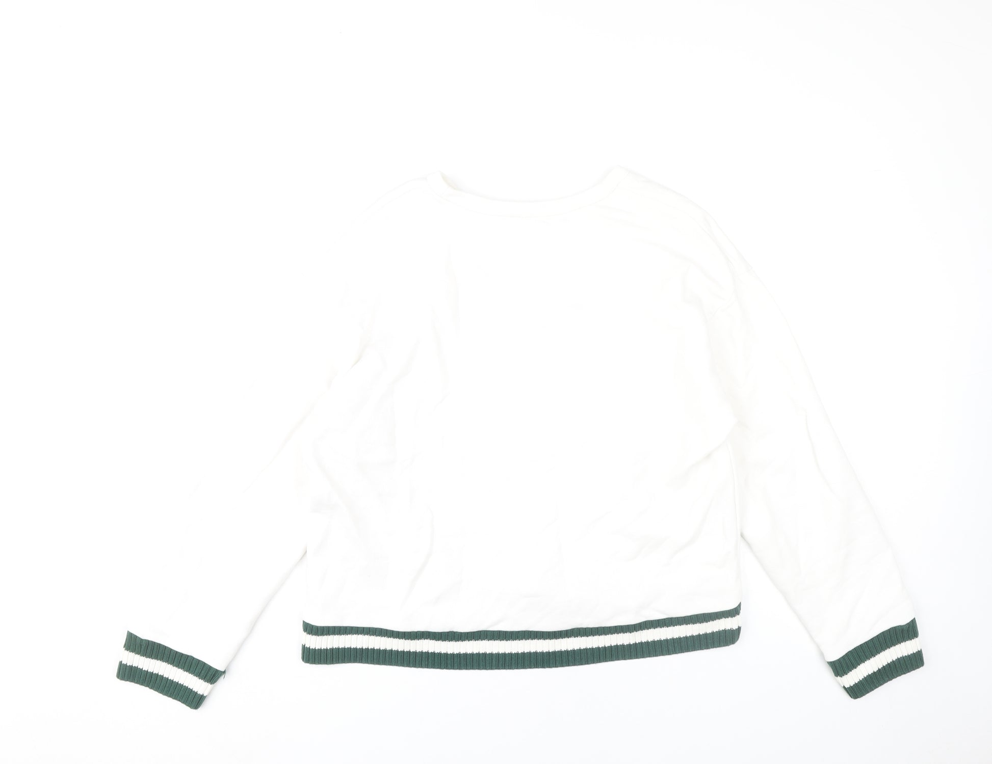 Elevate your casual wardrobe with this stylish Zara women’s white sweatshirt in size L. Crafted from 100% cotton, this pullover offers a soft and breathable feel, making it ideal for everyday wear throughout spring and autumn. The minimalist design features a clean crew neckline and long sleeves for a timeless silhouette, complemented beautifully by ribbed green and white striped hems on the cuffs and waistband, giving it a sporty edge. Designed in Portugal, it maintains Zara’s signature balance of modern fashion with comfort in mind.This sweatshirt has a regular fit that provides ease of movement while keeping its shape structured and flattering. The lightweight jersey fabric ensures it feels comfortable and versatile, allowing you to easily pair it with jeans, leggings, or skirts for a relaxed and chic look. Whether you’re heading out for a casual day, lounging at home, or layering for a cool evening, this piece is dependable and stylish.As part of Zara’s fashion-forward offerings, this sweatshirt embodies simplicity with subtle detail, making it a versatile staple in your wardrobe. The white colour keeps it fresh and easy to coordinate with other pieces, while the striped ribbed accents add distinction without being overpowering. Machine washable, it is easy to care for and wear again and again.Condition is excellent with no visible flaws, ensuring you can enjoy it right away with confidence. Perfect if you seek a classic sweatshirt with a modern twist, it’s a must-have item that blends comfort, versatility, and understated style all in one.