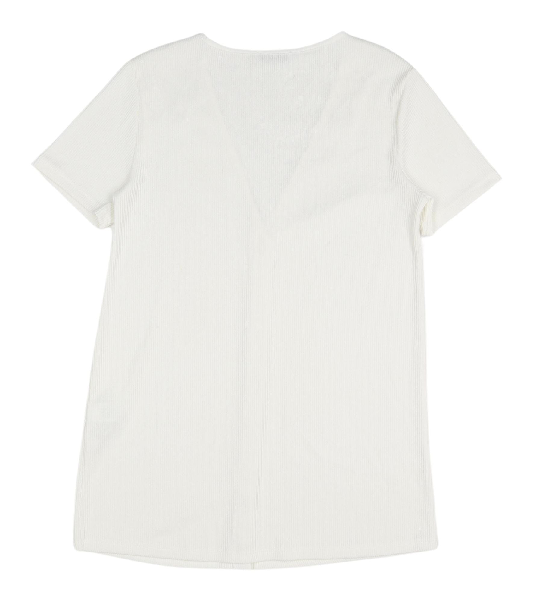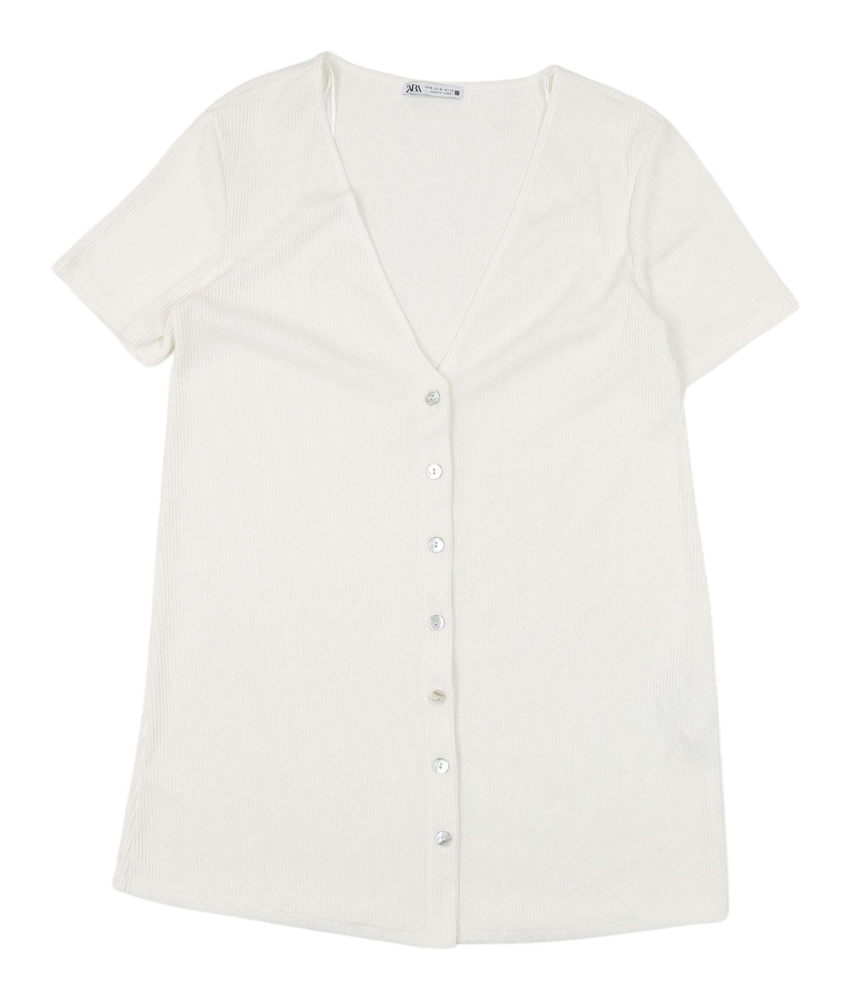 Elevate your casual wardrobe with this Zara Women's White V-Neck Button-Up Top, perfect for spring and summer occasions. Crafted from a soft blend of viscose, polyester, and elastane, this top offers a comfortable and flattering fit. The classic design features a V-neckline, short sleeves, and button accents, making it a versatile addition to any outfit. Ideal for casual outings, this solid colour top can be effortlessly paired with jeans or skirts. Its machine washable fabric ensures easy care, allowing you to enjoy its style and comfort all season long. Perfect for those seeking an elegant yet relaxed look, this piece is a must-have for fashion-forward individuals. Available in size M, this basic top aligns with your style and comfort needs, offering a seamless blend of modern elegance and casual simplicity.
