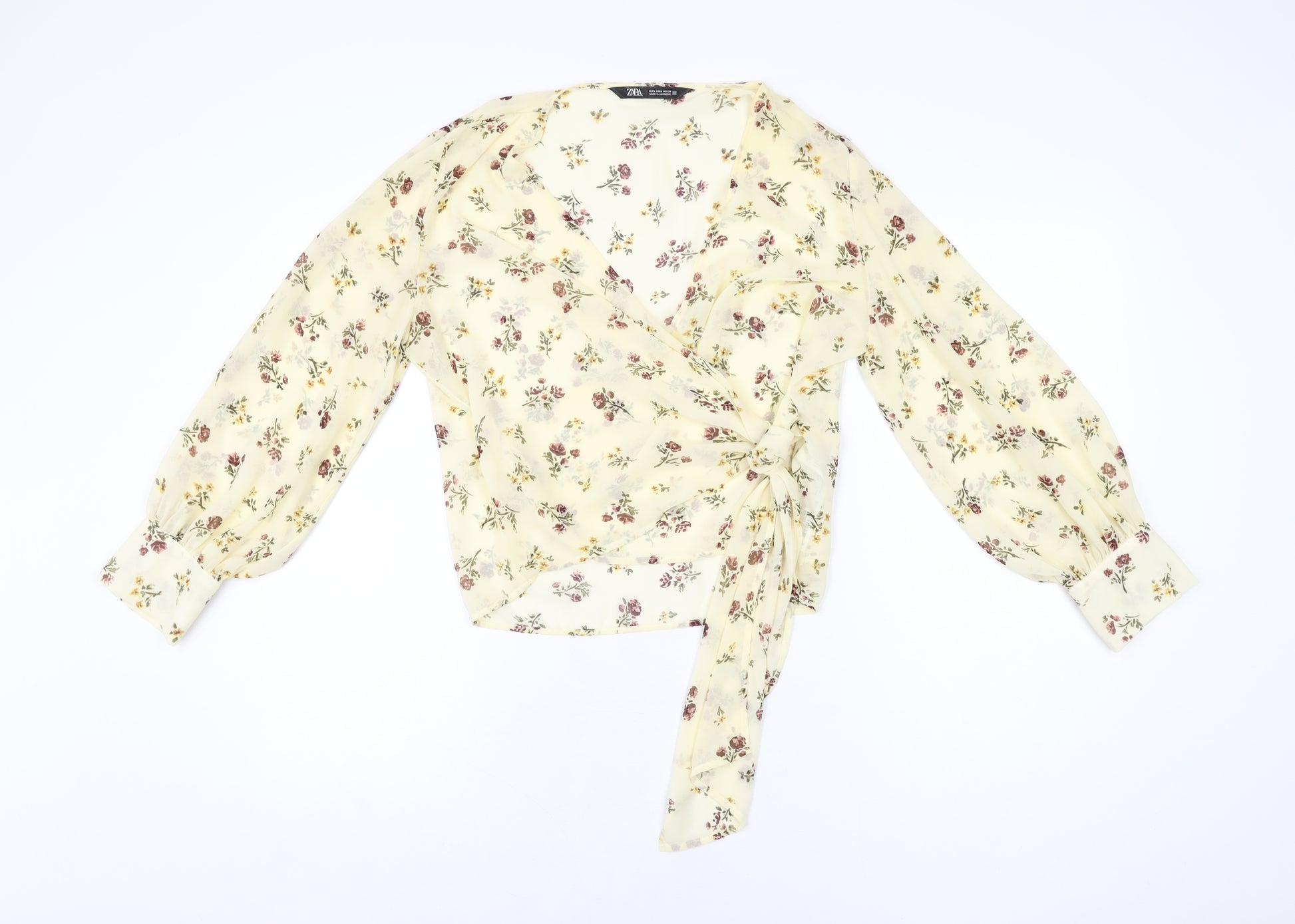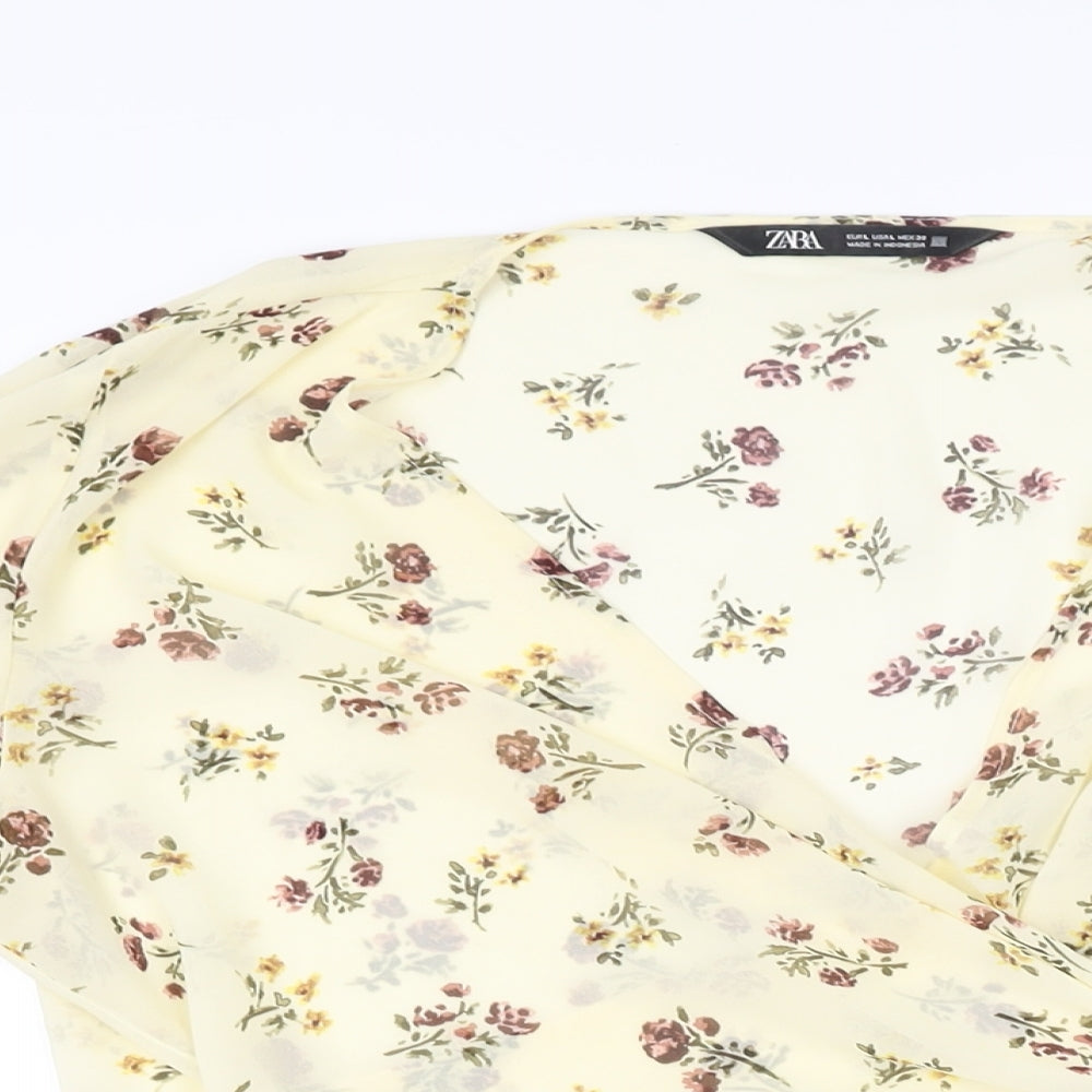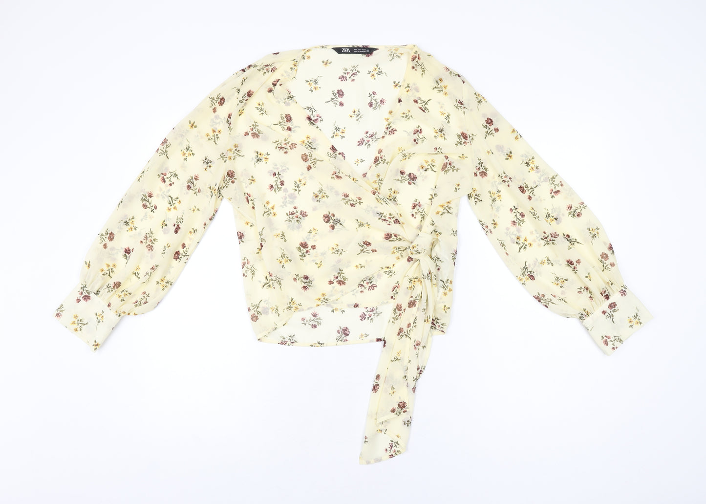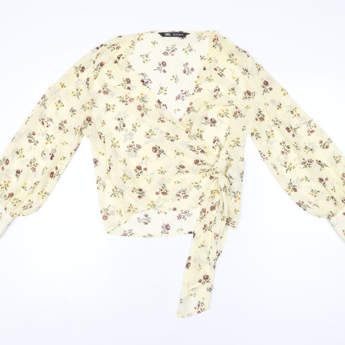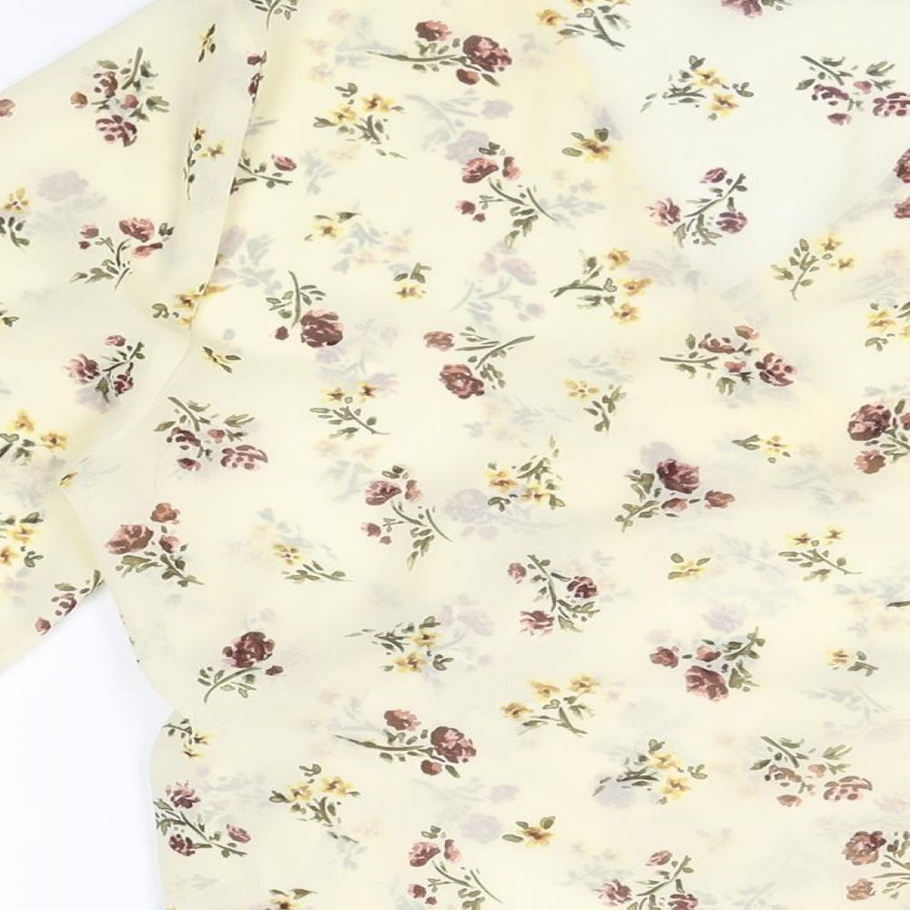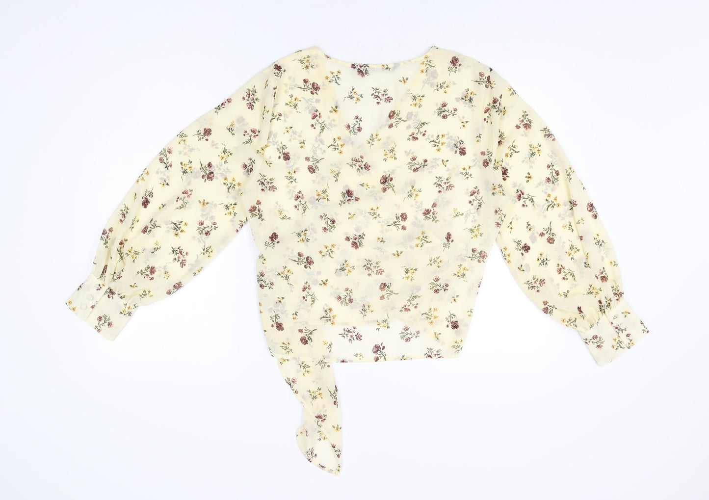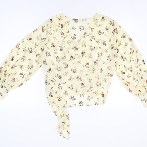 Womens Yellow Floral Polyester Wrap Blouse Size L V-Neck