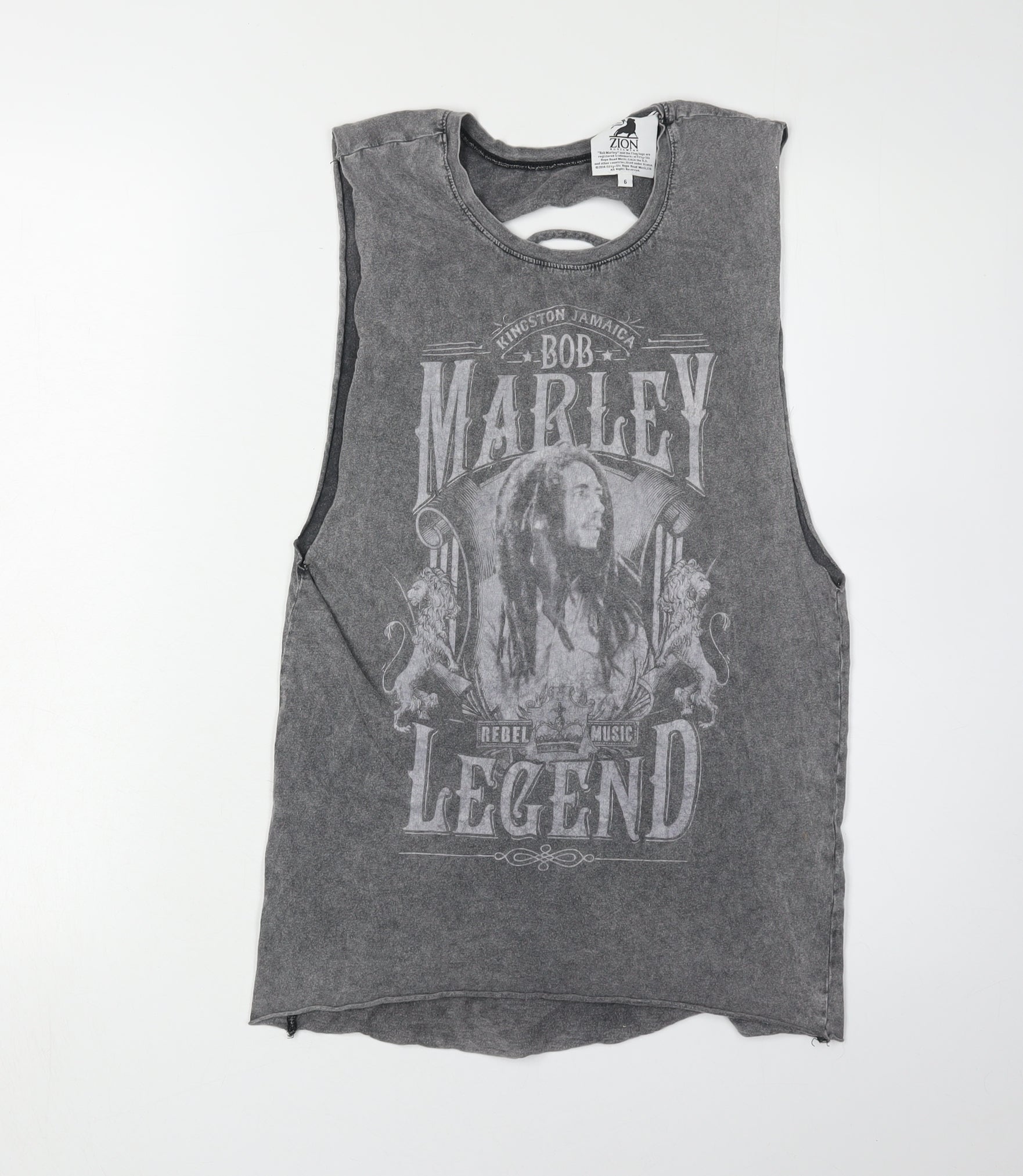 Embrace your inner music enthusiast with the Zion Rootswear Bob Marley tank top, perfect for any casual wardrobe. Crafted from 100% cotton jersey, this relaxed-fit tank is designed for comfort and breathability, making it an ideal choice for summer days or casual outings. Its solid grey colour and unique cut-out detail at the back add a touch of edgy style, while the iconic Bob Marley graphic on the front pays homage to the music legend. The tank features a classic crew neckline and sleeveless design, catering to those seeking effortless style with a hint of rock and roll flair. Ideal for music festivals, beach outings, or just a leisurely day in the sun, this tank is versatile enough to complement a variety of casual outfits. Whether paired with denim shorts or layered under a jacket, the Zion Rootswear tank top brings both comfort and a nod to musical heritage to any ensemble. Gently used with no signs of damage, it remains in excellent condition, ready to become a staple in your summer wardrobe. Don't miss out on this unique piece that captures the spirit of legendary music and fashion.
